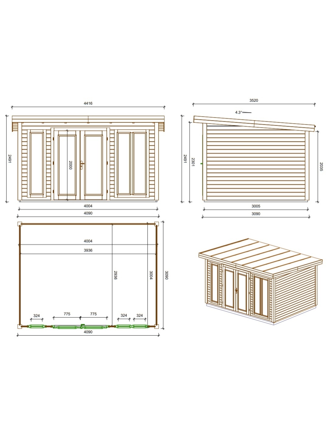 Gartenhaus aus Holz 000008 von ALTANKA p.s.a. ist idealer Ort zum Entspannen und zum Spaß für die ganze Familie. Das Haus ist aus hochwertigem Holz gefertigt. Es ist 4,04M breit und 3,09M tief, was viel Platz innen bietet.
