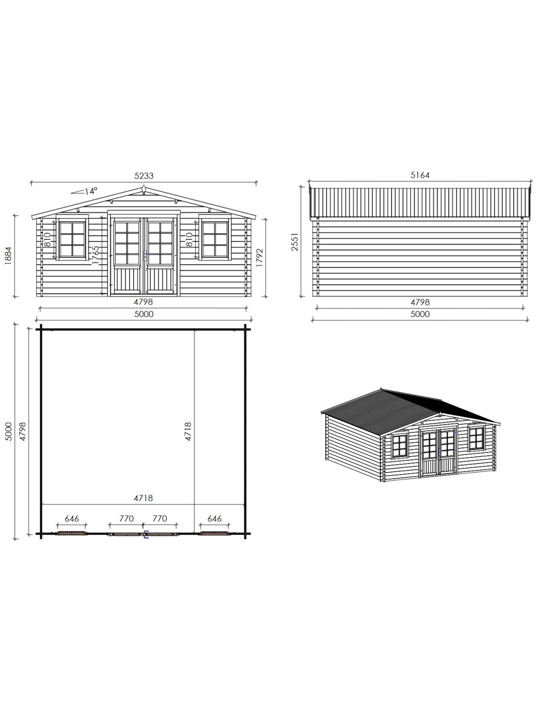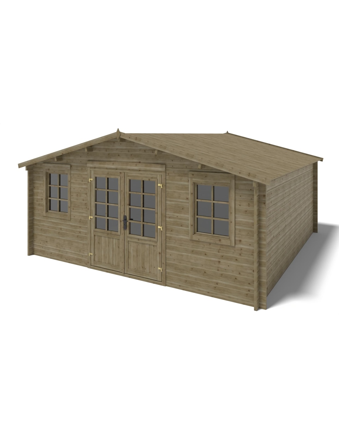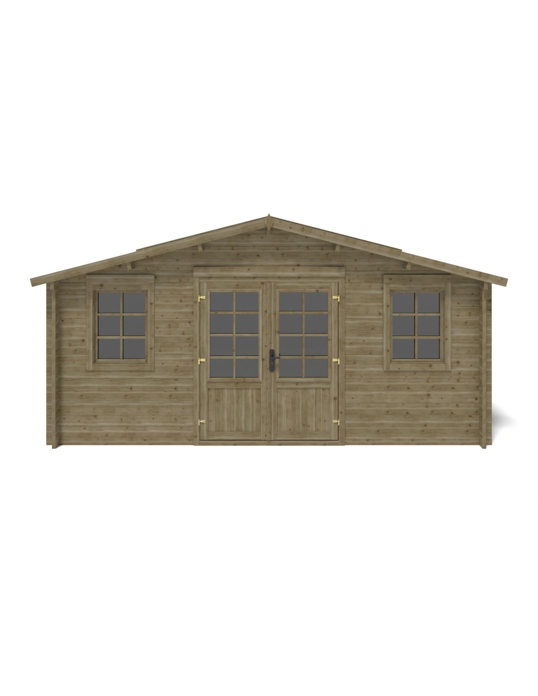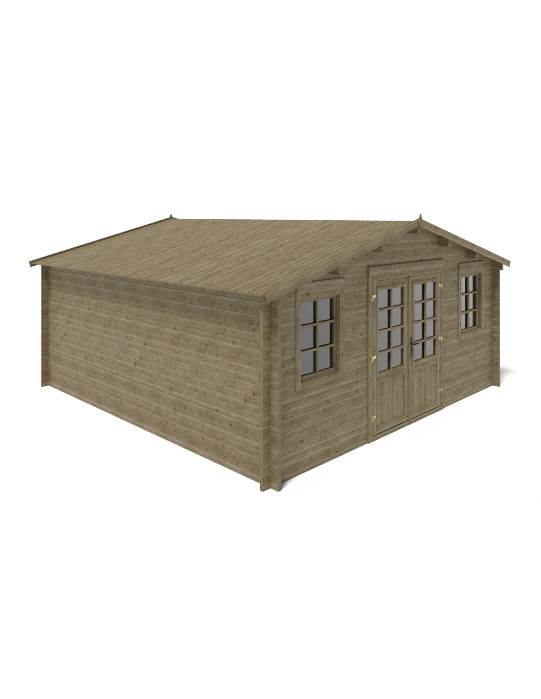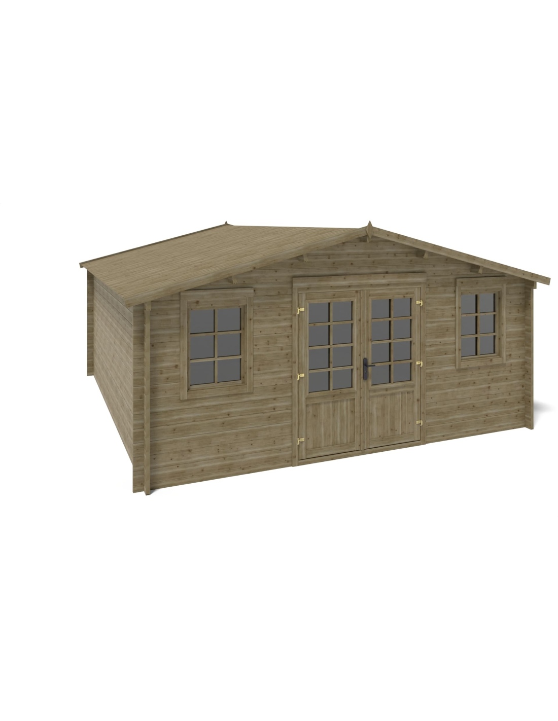 Gartenhaus aus Holz DOM707 von ALTANKA p.s.a. Es ist aus hochwertigem Holz gefertigt. Es ist 5M breit und 5M tief.