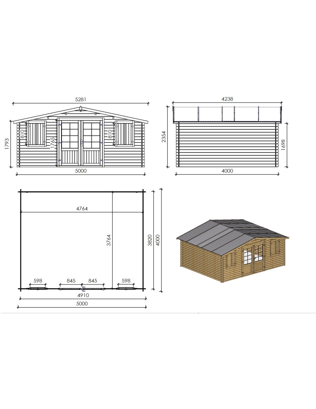 Die Fotos zeigen das Holzhaus DOM439 mit der Fläche von 20 m2, Frontbreite von 5M und Tiefe von 4M.