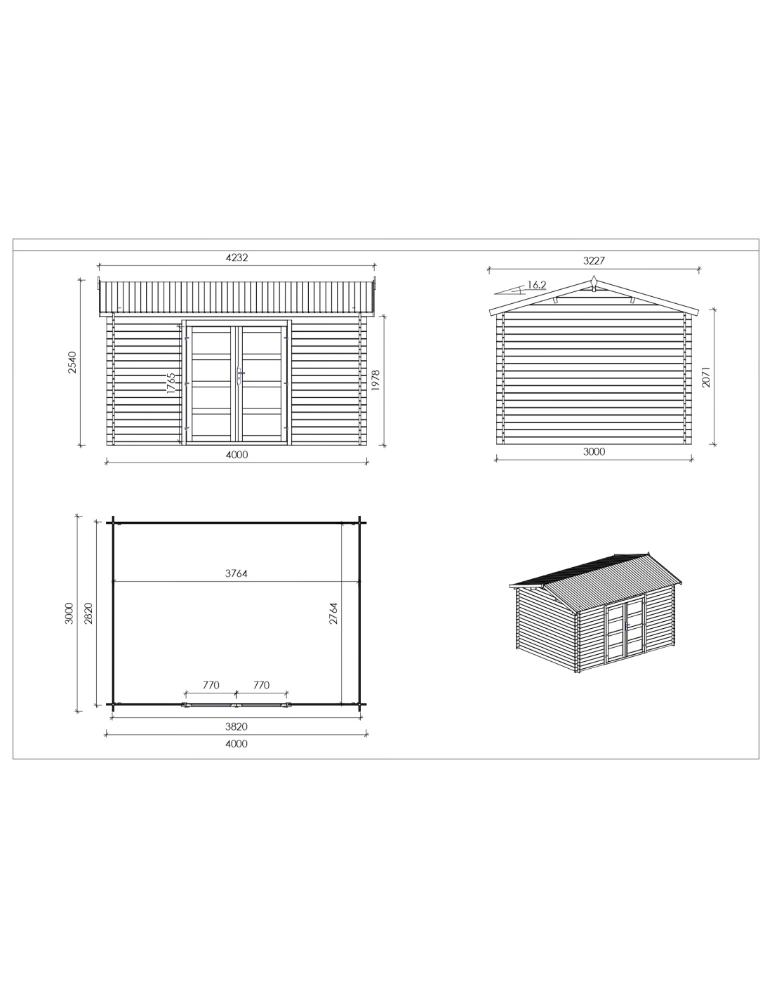Gartenhaus aus Holz DOM677 von ALTANKA p.s.a. Es ist aus hochwertigem Holz gefertigt. Es ist 4M breit und 3M tief.