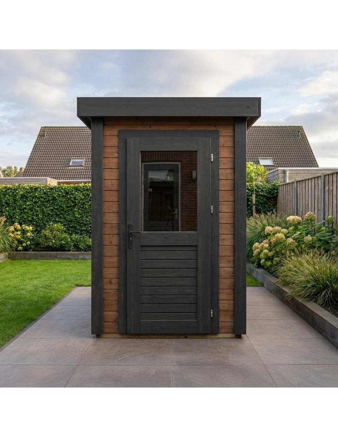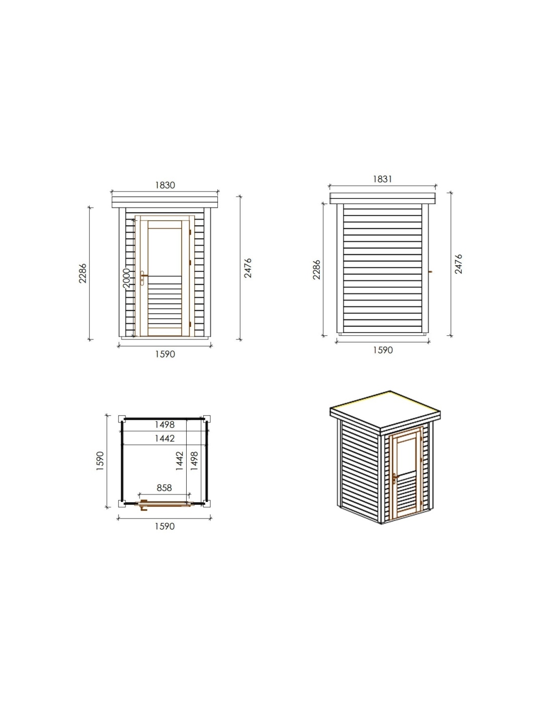 Die Fotos zeigen das Holzhaus 000010 mit der Fläche von 2.53 m2, Frontbreite von 1.59M und Tiefe von 1.59M.