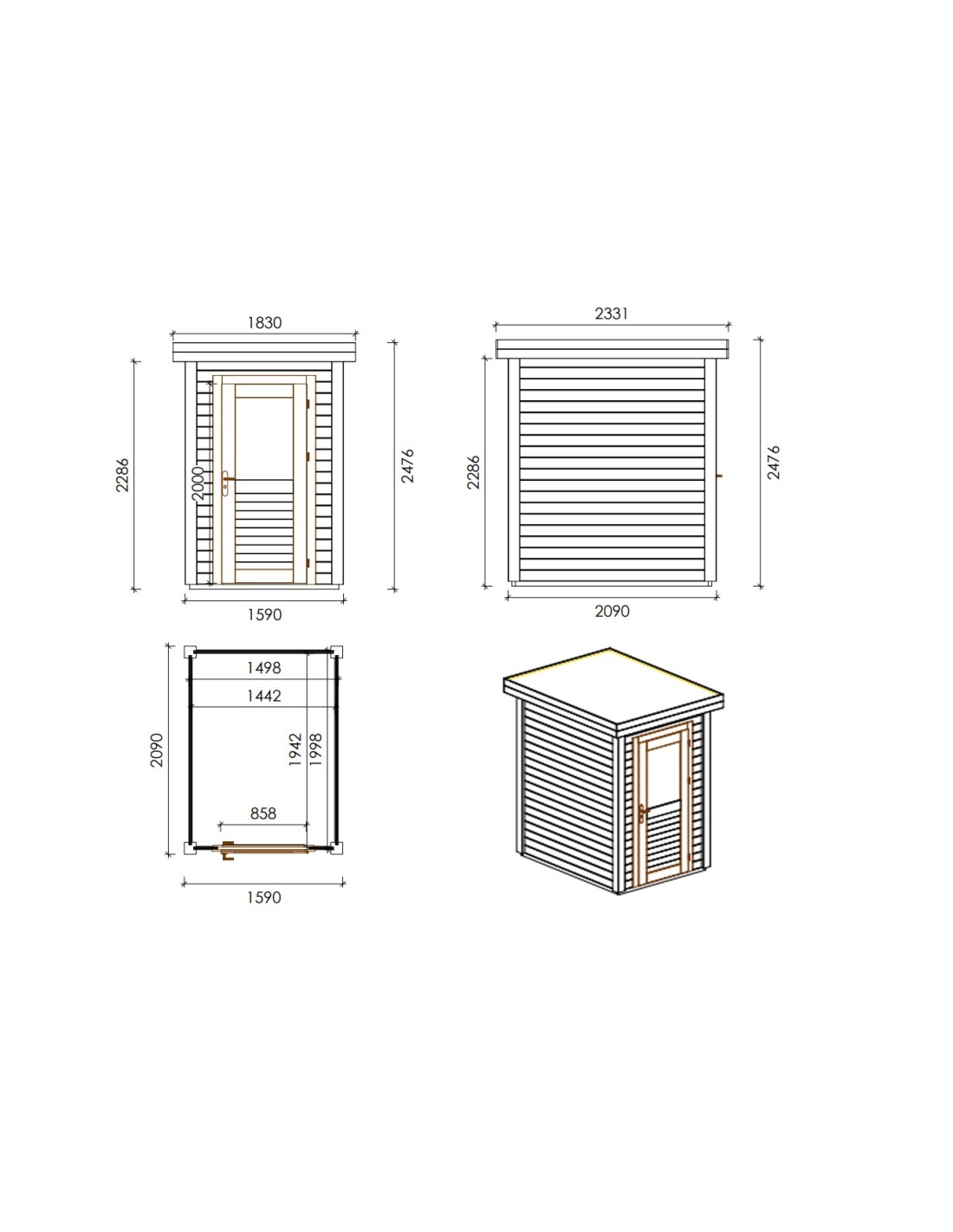 Die Fotos zeigen das Holzhaus 000011 mit der Fläche von 3.32 m2, Frontbreite von 1.59M und Tiefe von 2.09M.