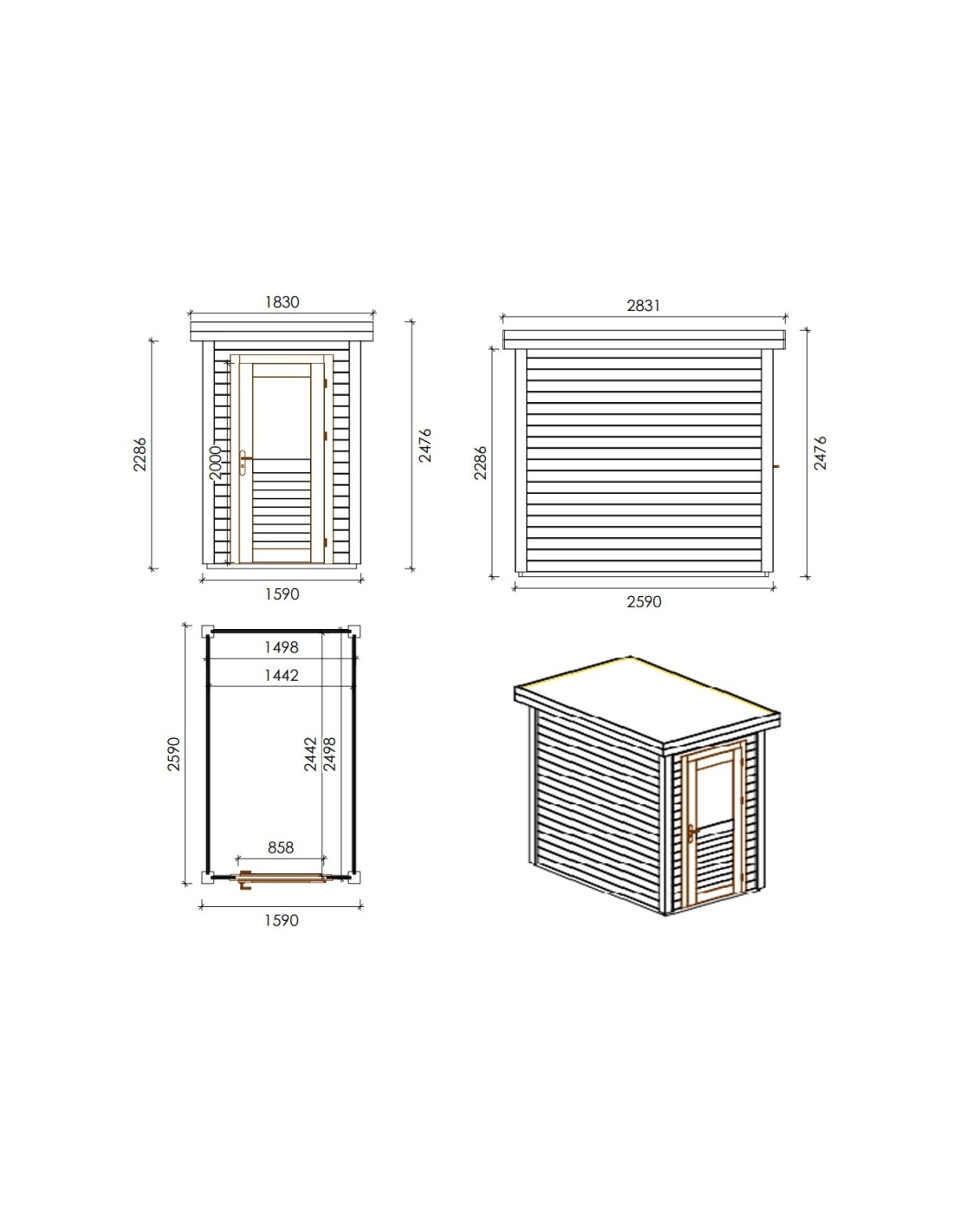 Die Fotos zeigen das Holzhaus 000012 mit der Fläche von 4.12 m2, Frontbreite von 1.59M und Tiefe von 2.59M.