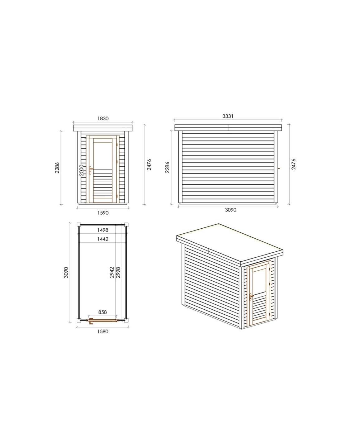 Die Fotos zeigen das Holzhaus 000013 mit der Fläche von 4.91 m2, Frontbreite von 1.59M und Tiefe von 3.09M.