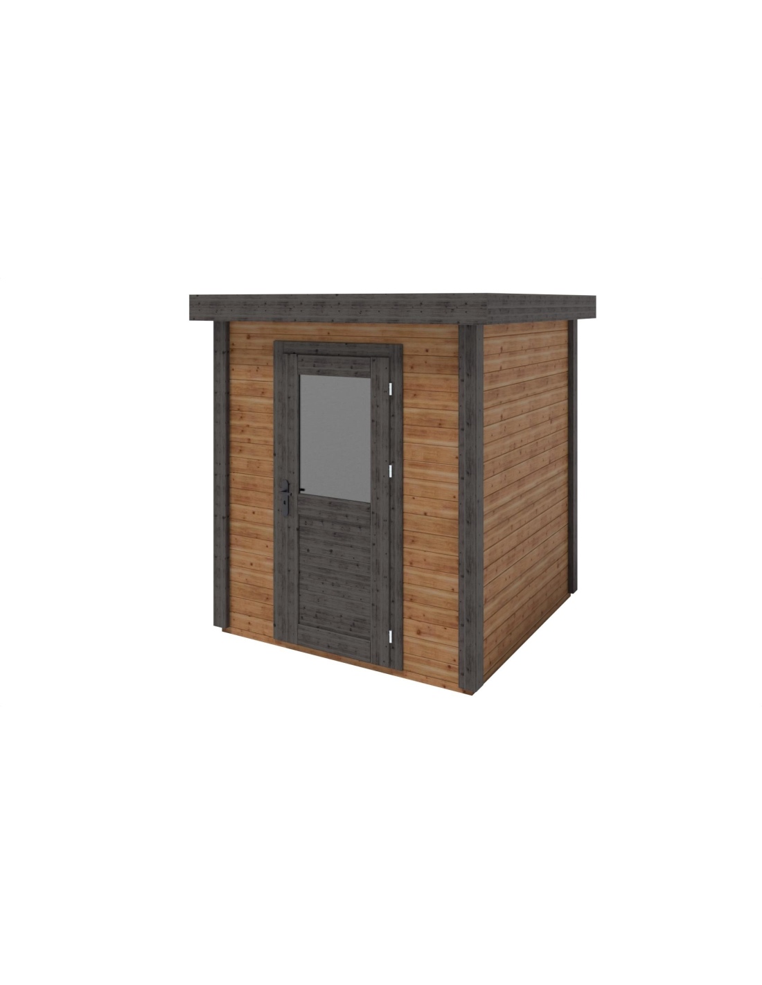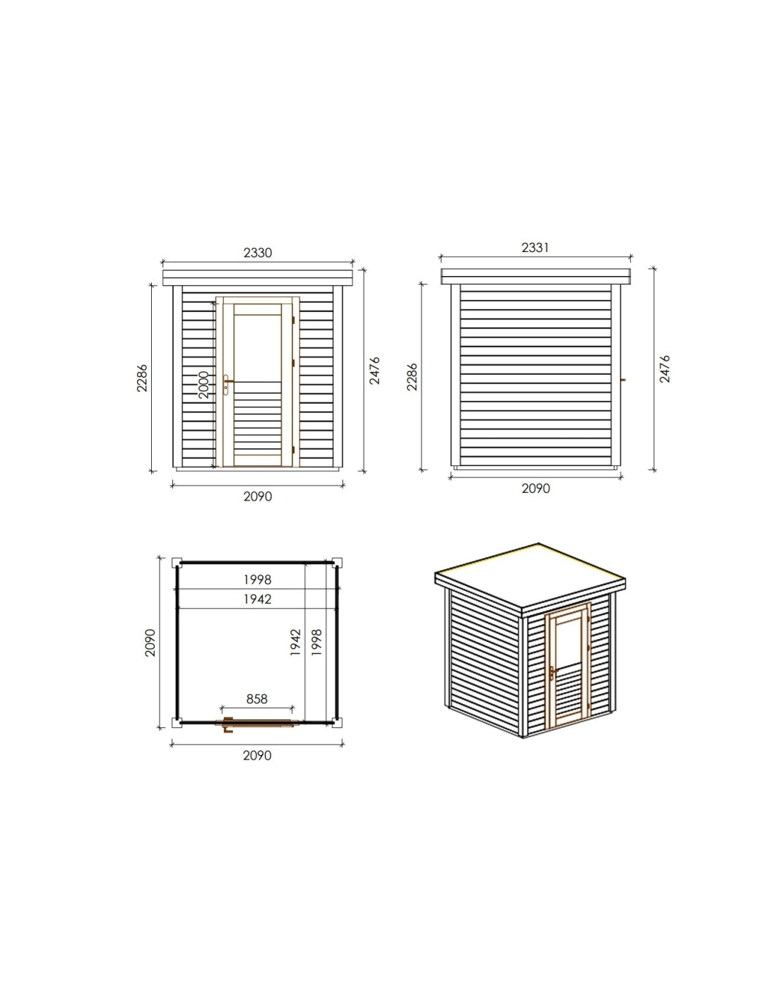 Die Fotos zeigen das Holzhaus 000015 mit der Fläche von 4.37 m2, Frontbreite von 2.09M und Tiefe von 2.09M.