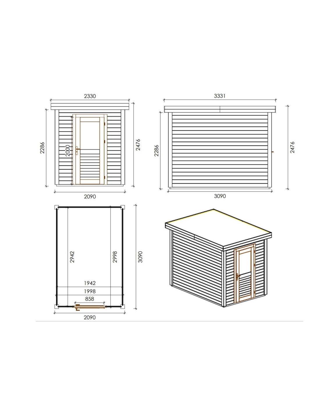 Die Fotos zeigen das Holzhaus 000017 mit der Fläche von 6.46 m2, Frontbreite von 2.09M und Tiefe von 3.09M.