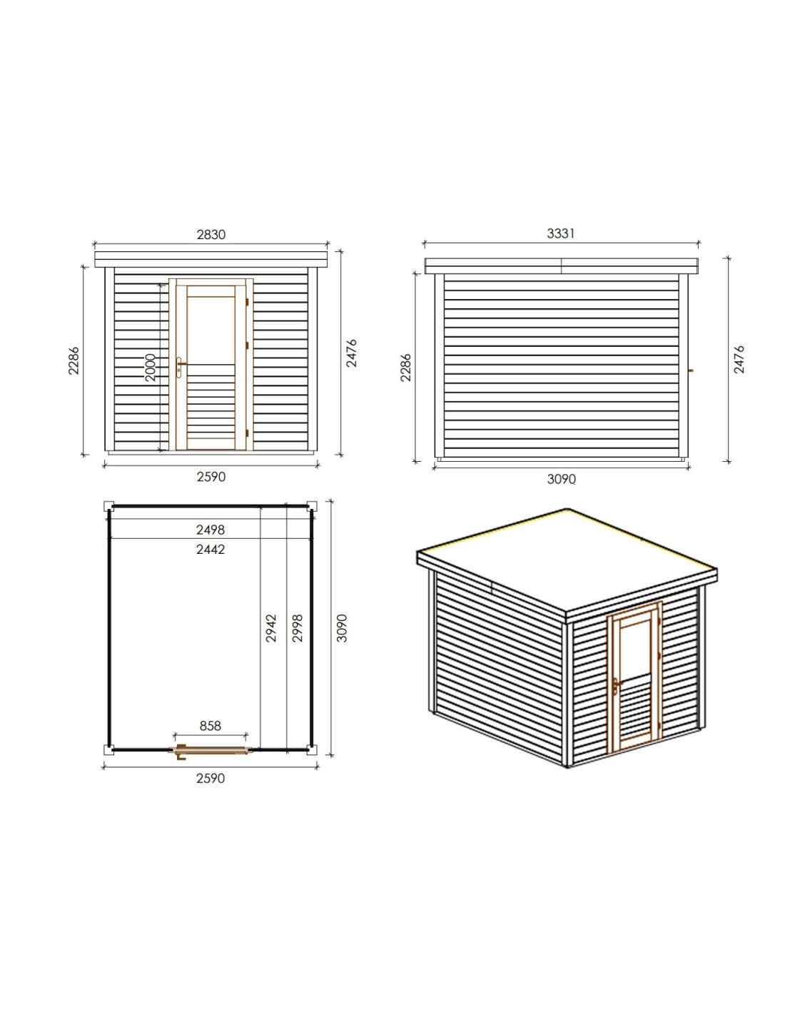 Die Fotos zeigen das Holzhaus 000021 mit der Fläche von 8 m2, Frontbreite von 2.59M und Tiefe von 3.09M.