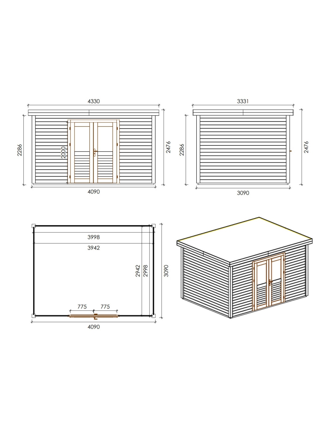 Die Fotos zeigen das Holzhaus 000026 mit der Fläche von 12.64 m2, Frontbreite von 4.09M und Tiefe von 3.09M.