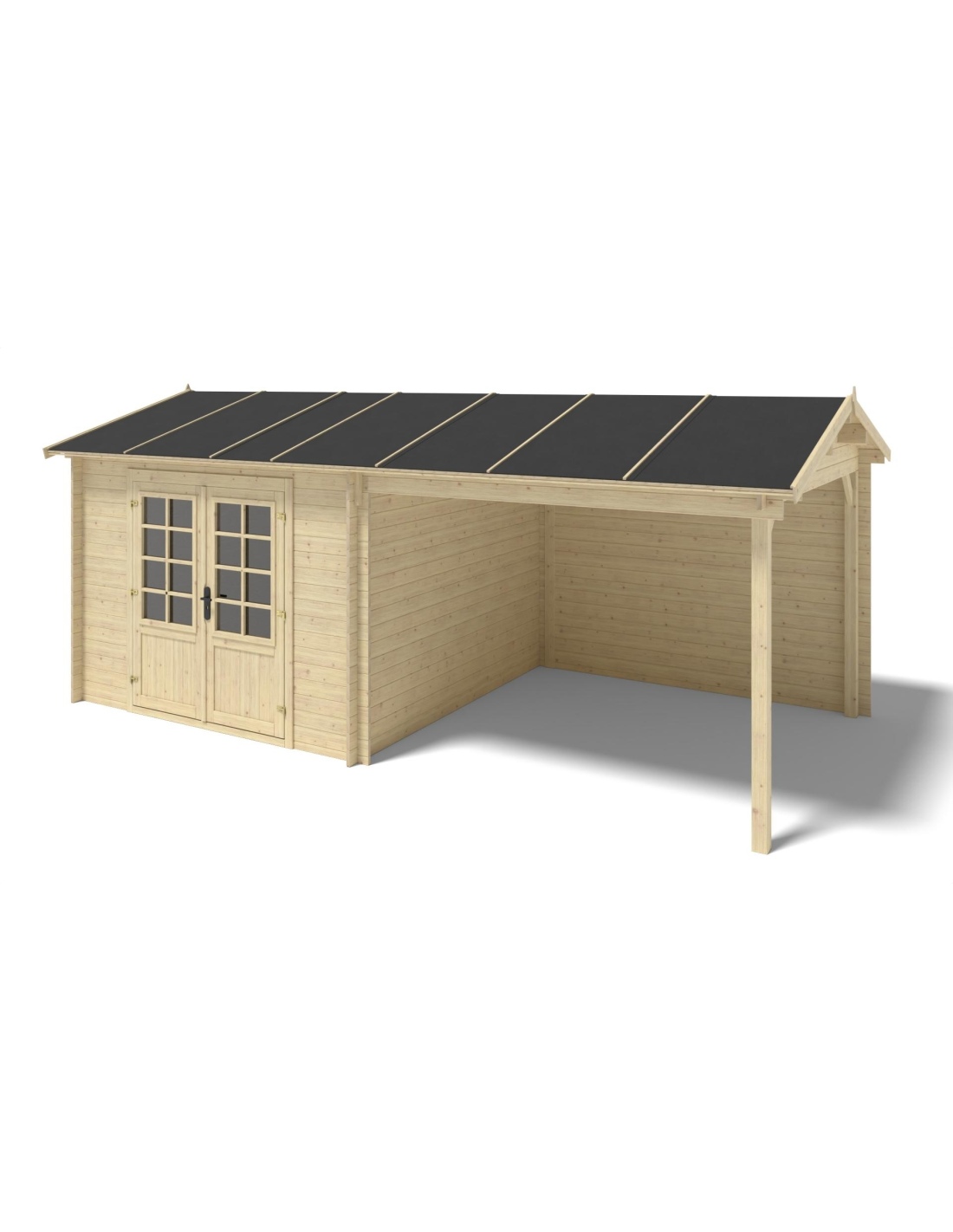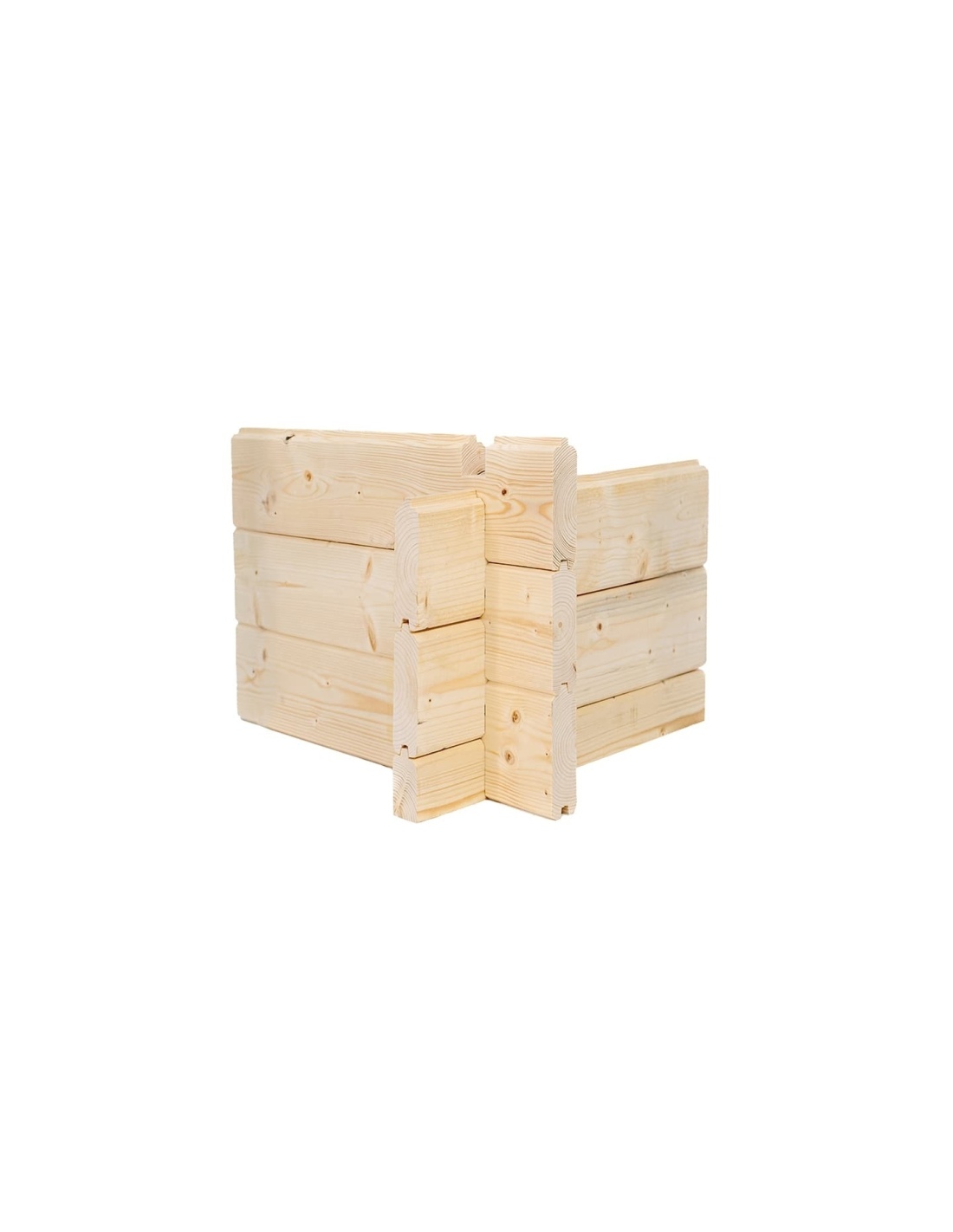 - Bauart: Blockhaus aus gerade zugeschnittenen Brettern