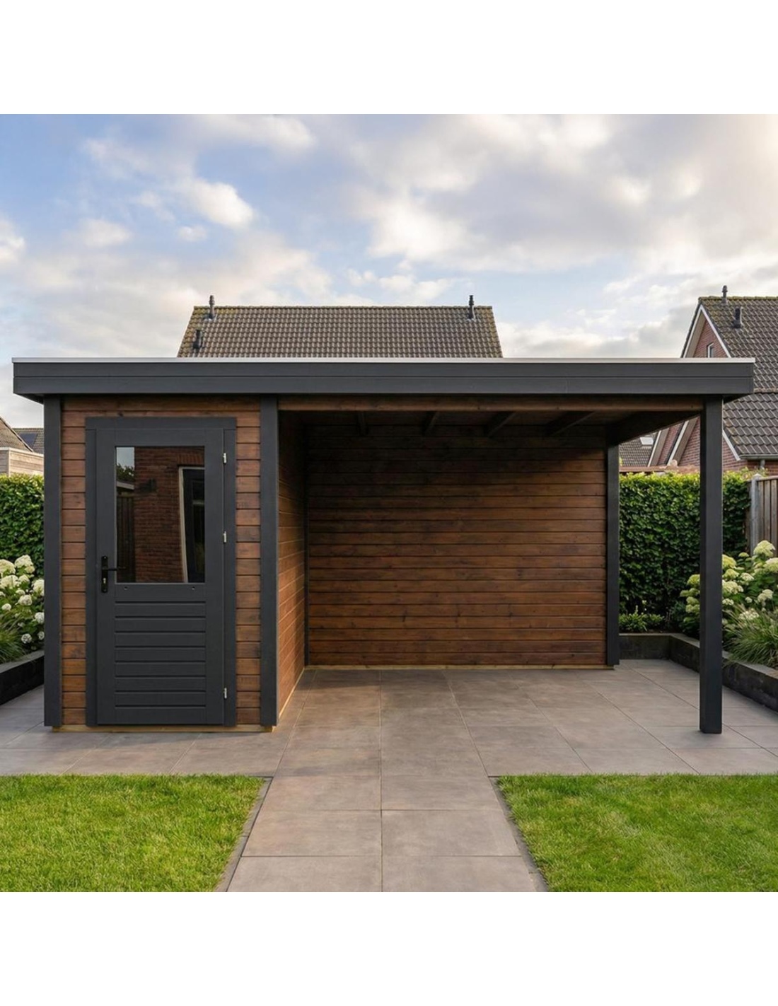 (!) Das Produkt enthält keine Dacheindeckung und kein Wasserableitungssystem – es ist notwendig, eine EPDM-Folie mit Montageprofilen sowie ein Fallrohr zur Dachentwässerung zu erwerben, um Schutz vor Witterungseinflüssen zu gewährleisten.