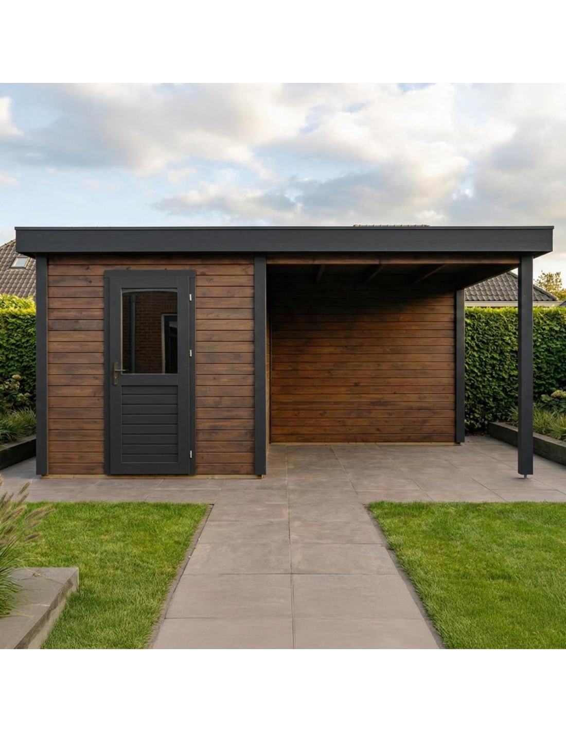 (!) Das Produkt enthält keine Dacheindeckung und kein Wasserableitungssystem – es ist notwendig, eine EPDM-Folie mit Montageprofilen sowie ein Fallrohr zur Dachentwässerung zu erwerben, um Schutz vor Witterungseinflüssen zu gewährleisten.