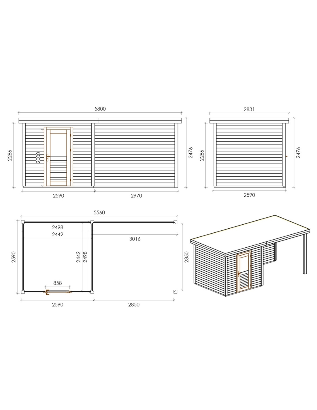 Die Fotos zeigen das Holzhaus 000045 mit der Fläche von 14.4 m2, Frontbreite von 2.59M und Tiefe von 2.59M.