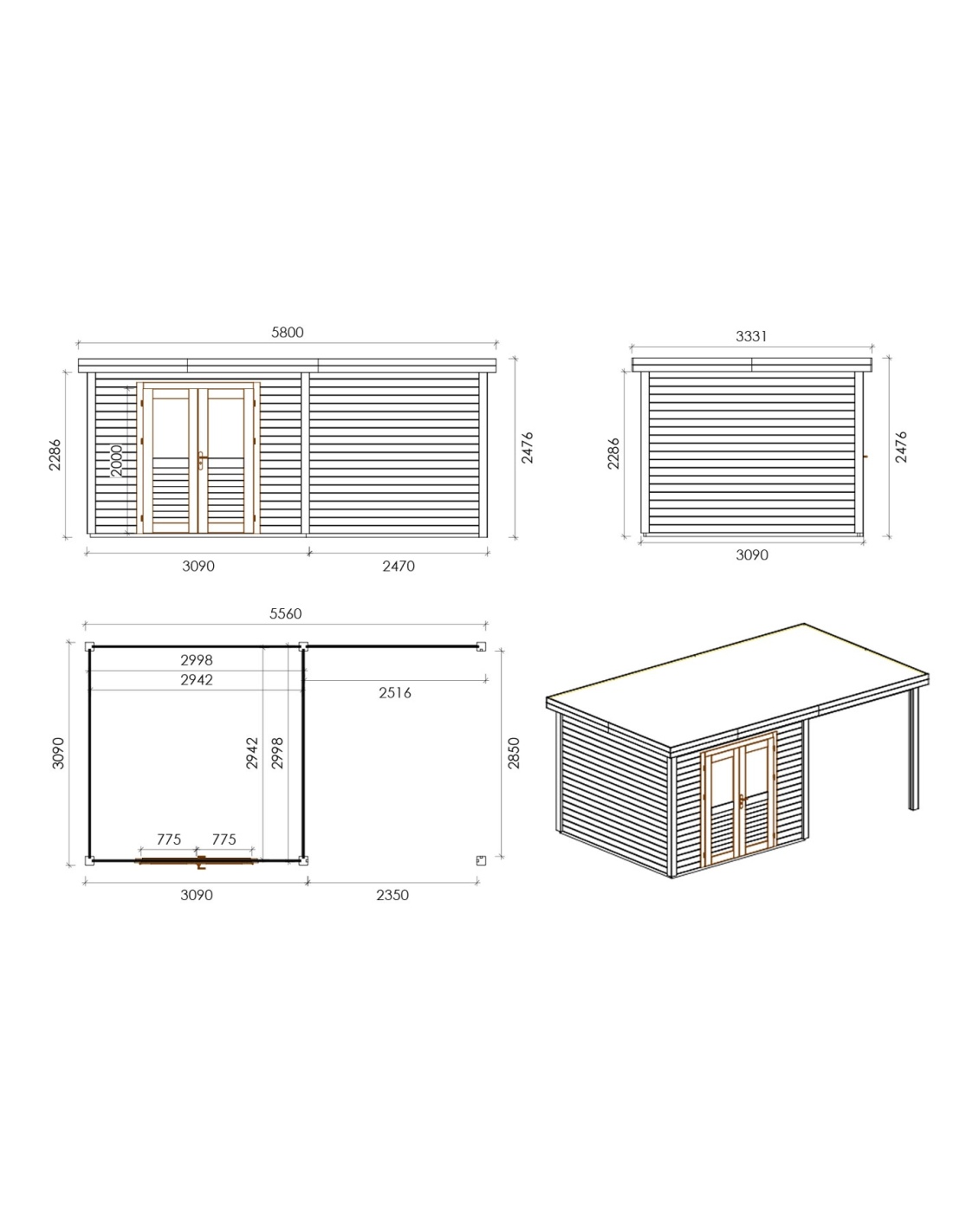 Die Fotos zeigen das Holzhaus 000051 mit der Fläche von 17.18 m2, Frontbreite von 3.09M und Tiefe von 3.09M.