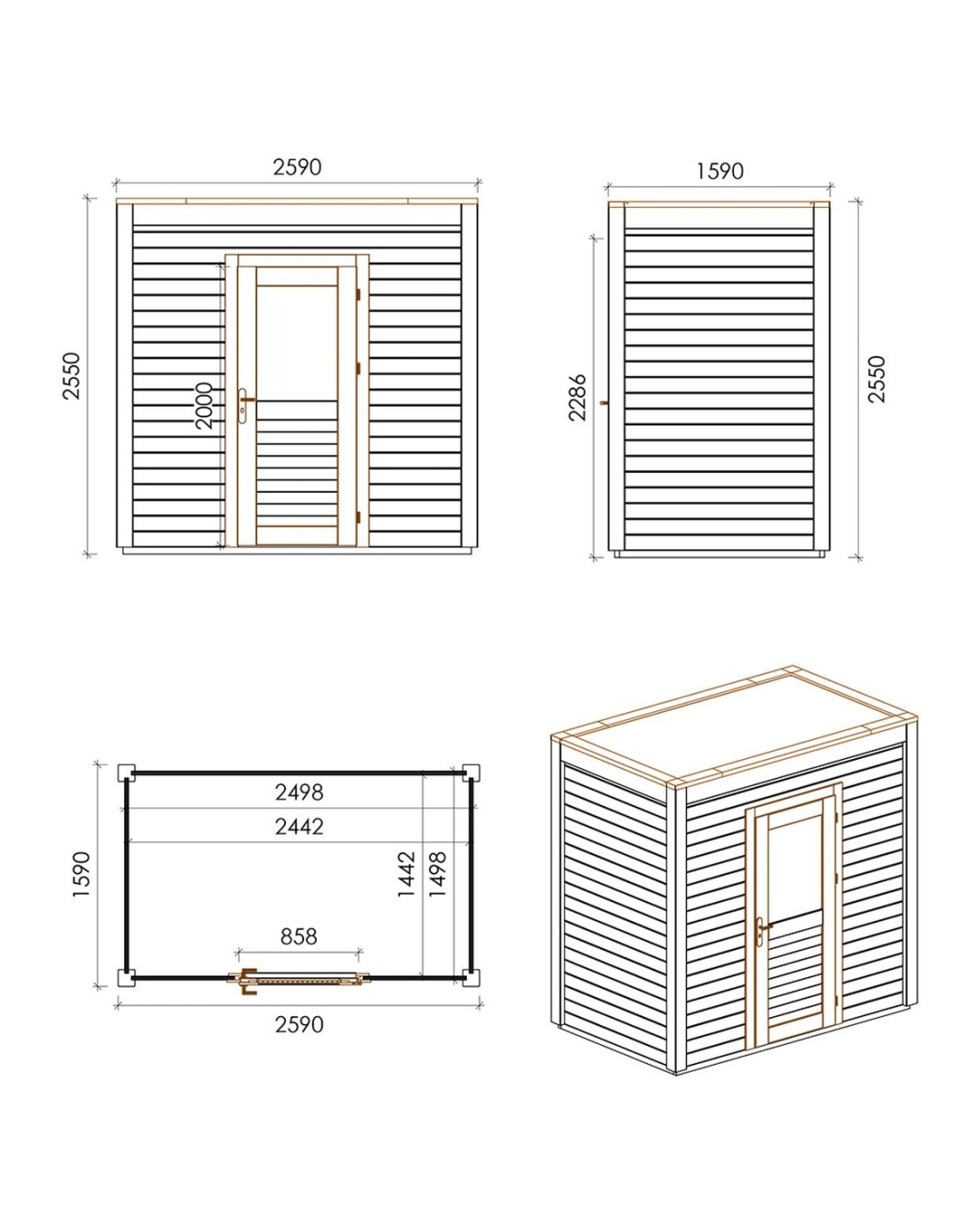 Die Fotos zeigen das Holzhaus 000067 mit der Fläche von 4.12 m2, Frontbreite von 2.59M und Tiefe von 1.59M.