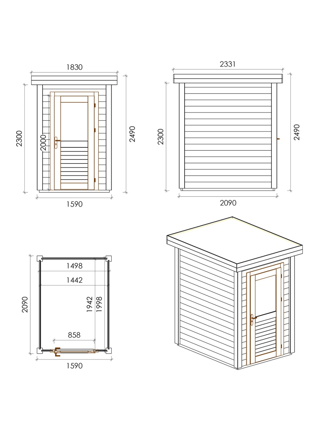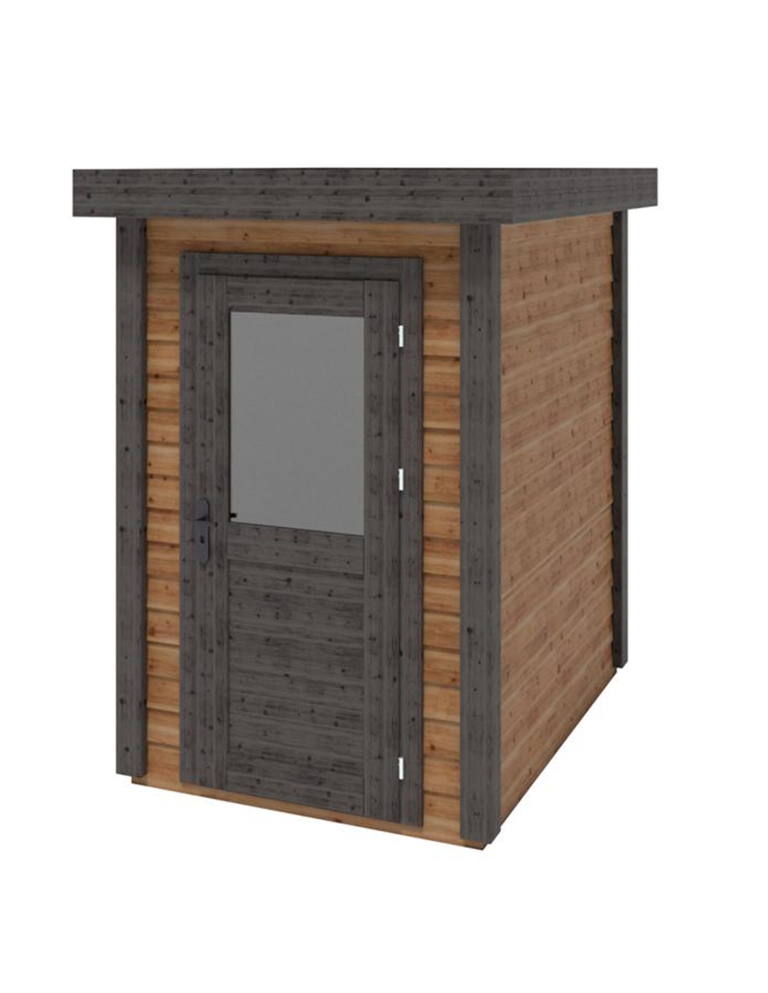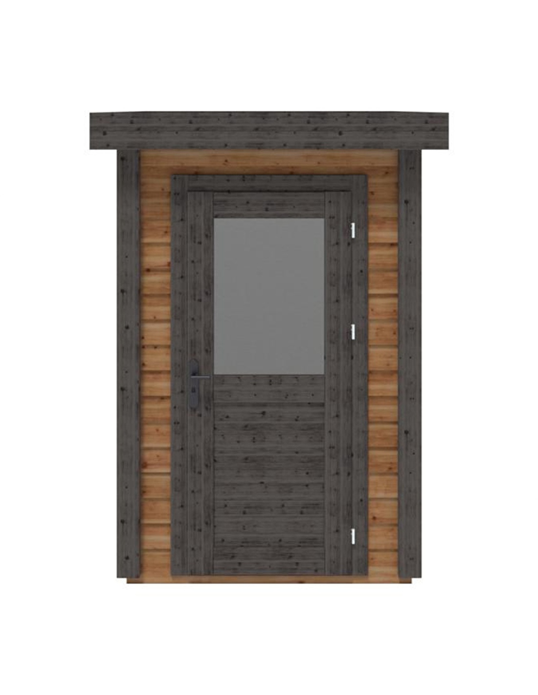Die Fotos zeigen das Holzhaus 000109 mit der Fläche von 3.32 m2, Frontbreite von 1.59M und Tiefe von 2.09M.