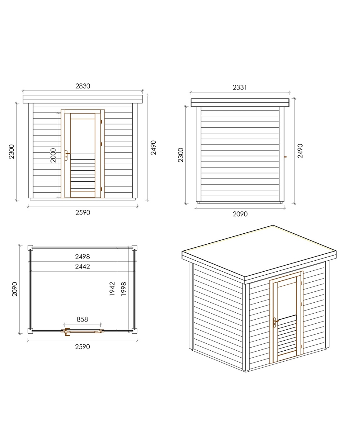 Die Fotos zeigen das Holzhaus 000117 mit der Fläche von 5.41 m2, Frontbreite von 2.59M und Tiefe von 2.09M.