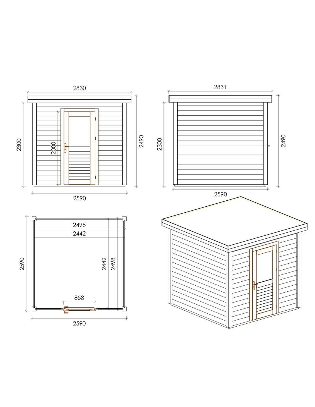 Die Fotos zeigen das Holzhaus 000118 mit der Fläche von 6.71 m2, Frontbreite von 2.59M und Tiefe von 2.59M.
