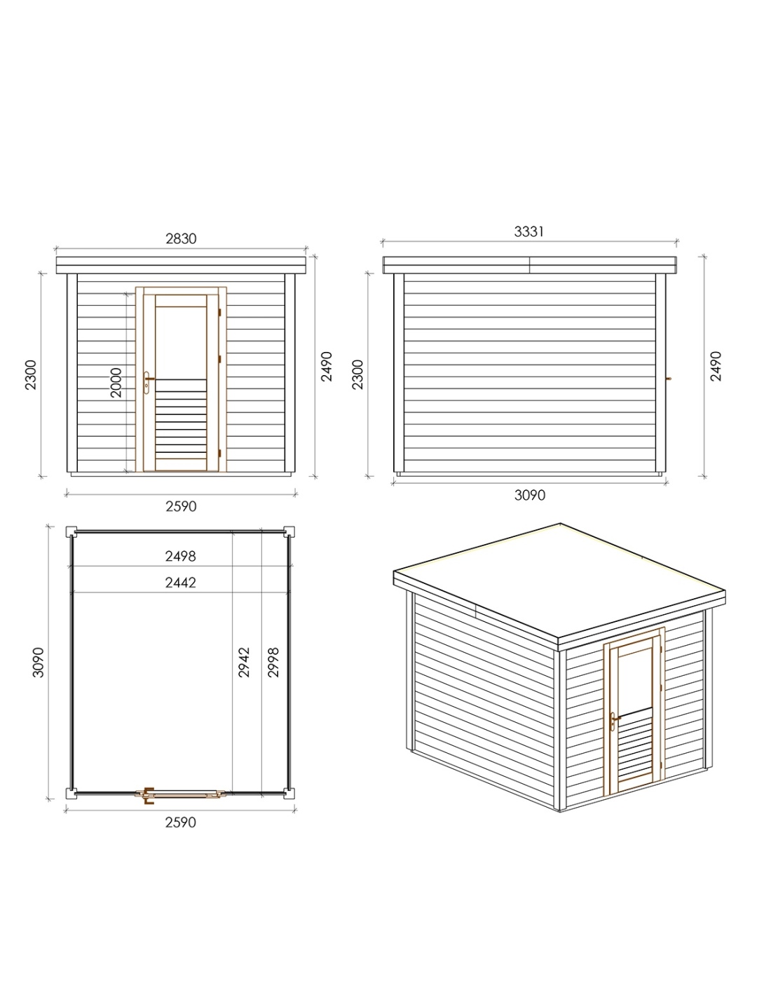 Die Fotos zeigen das Holzhaus 000119 mit der Fläche von 8 m2, Frontbreite von 2.59M und Tiefe von 3.09M.