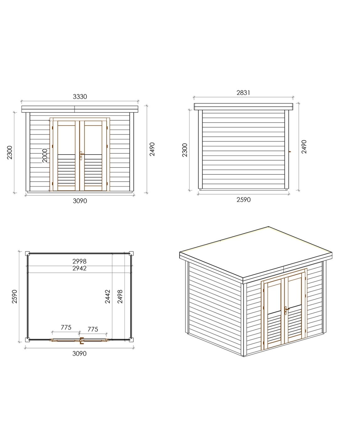 Die Fotos zeigen das Holzhaus 000120 mit der Fläche von 8 m2, Frontbreite von 3.09M und Tiefe von 2.59M.