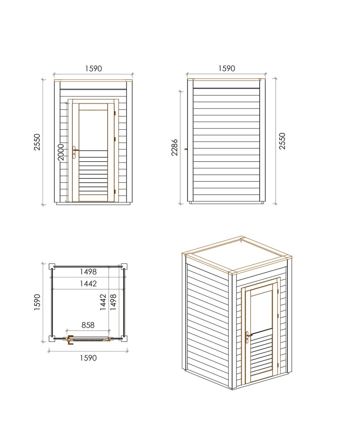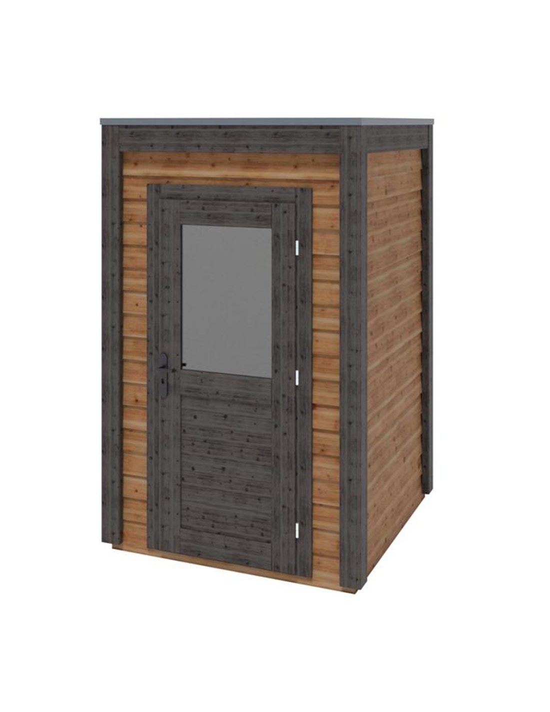 Die Fotos zeigen das Holzhaus 000157 mit der Fläche von 2.53 m2, Frontbreite von 1.59M und Tiefe von 1.59M.
