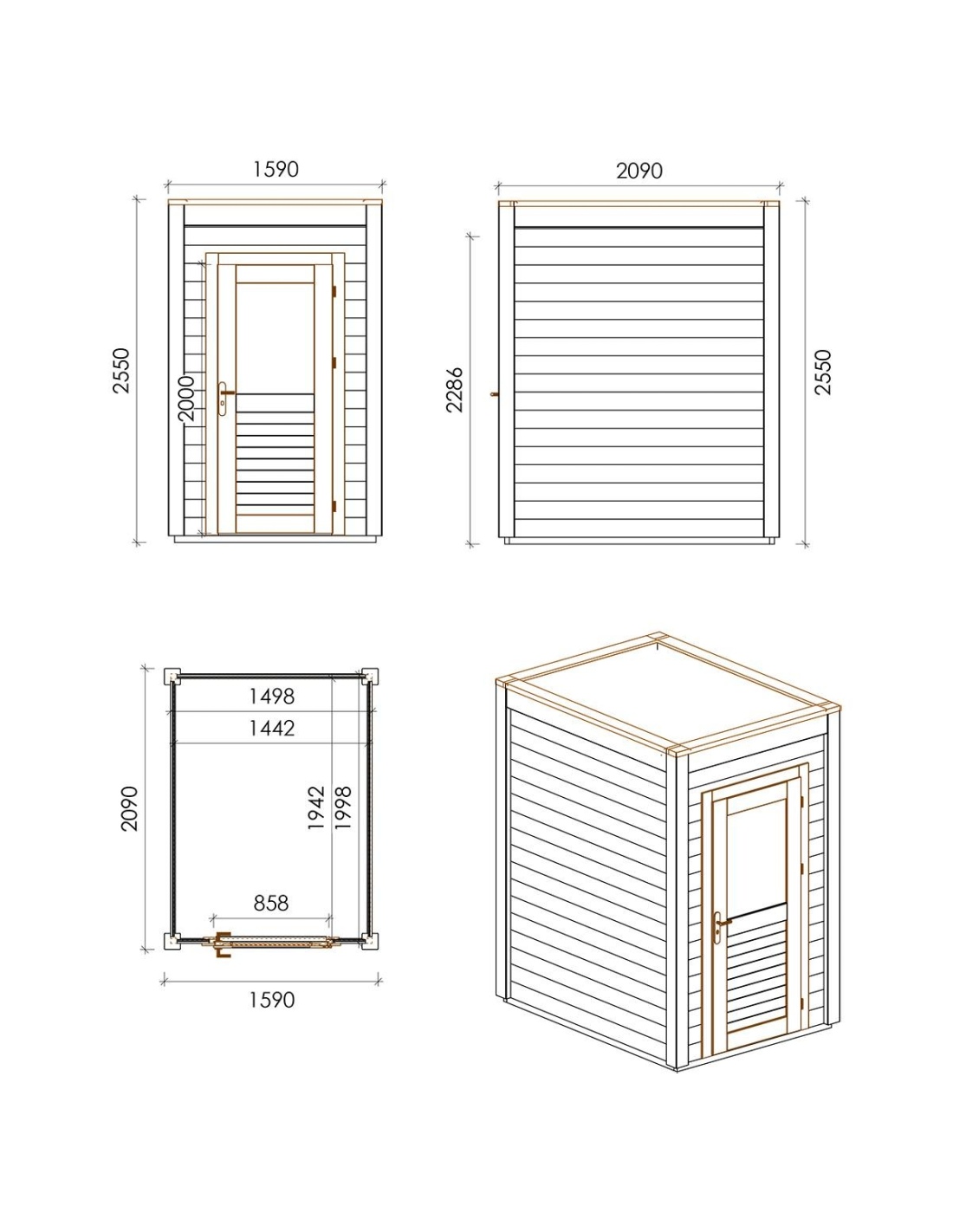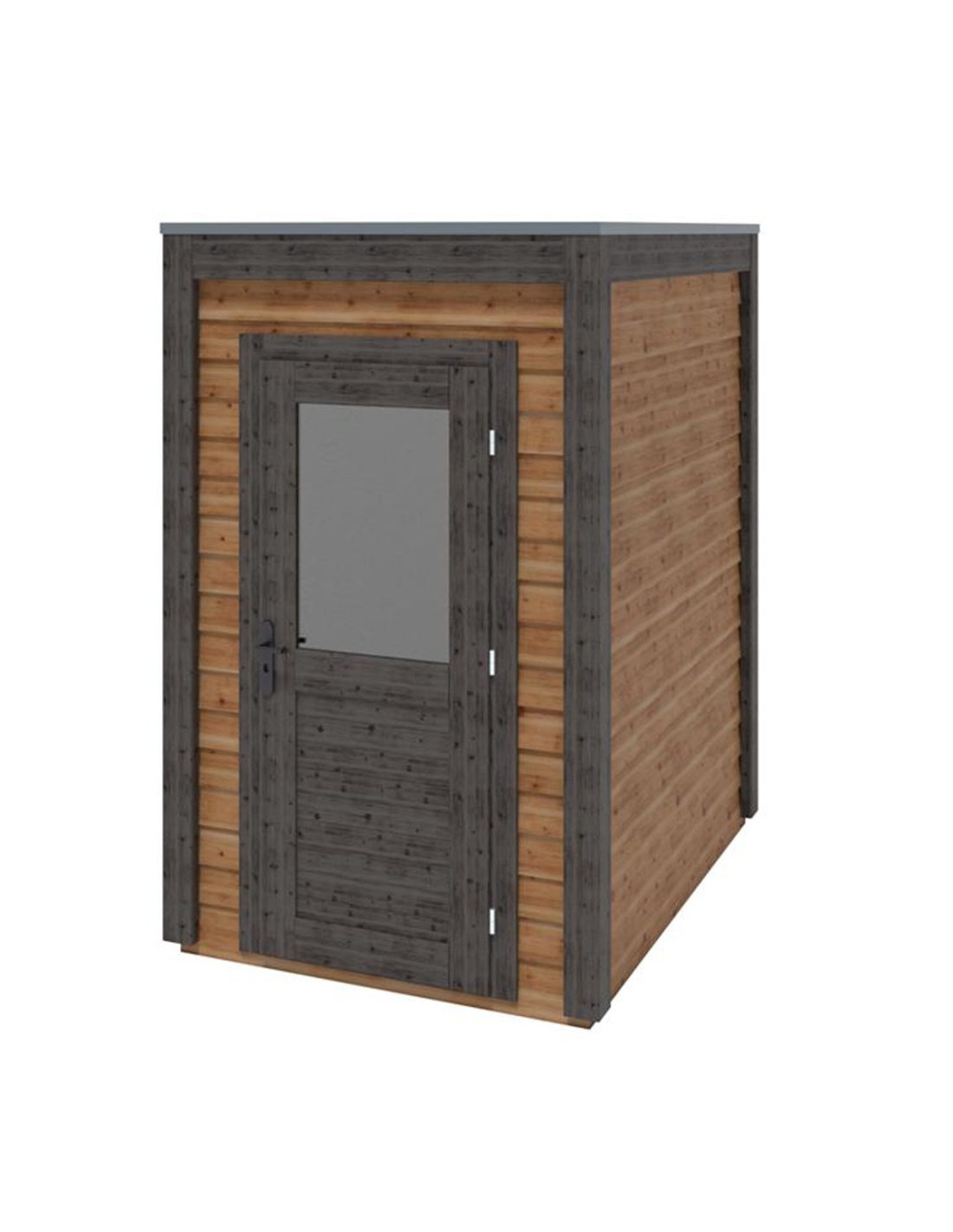 Die Fotos zeigen das Holzhaus 000158 mit der Fläche von 3.32 m2, Frontbreite von 1.59M und Tiefe von 2.09M.