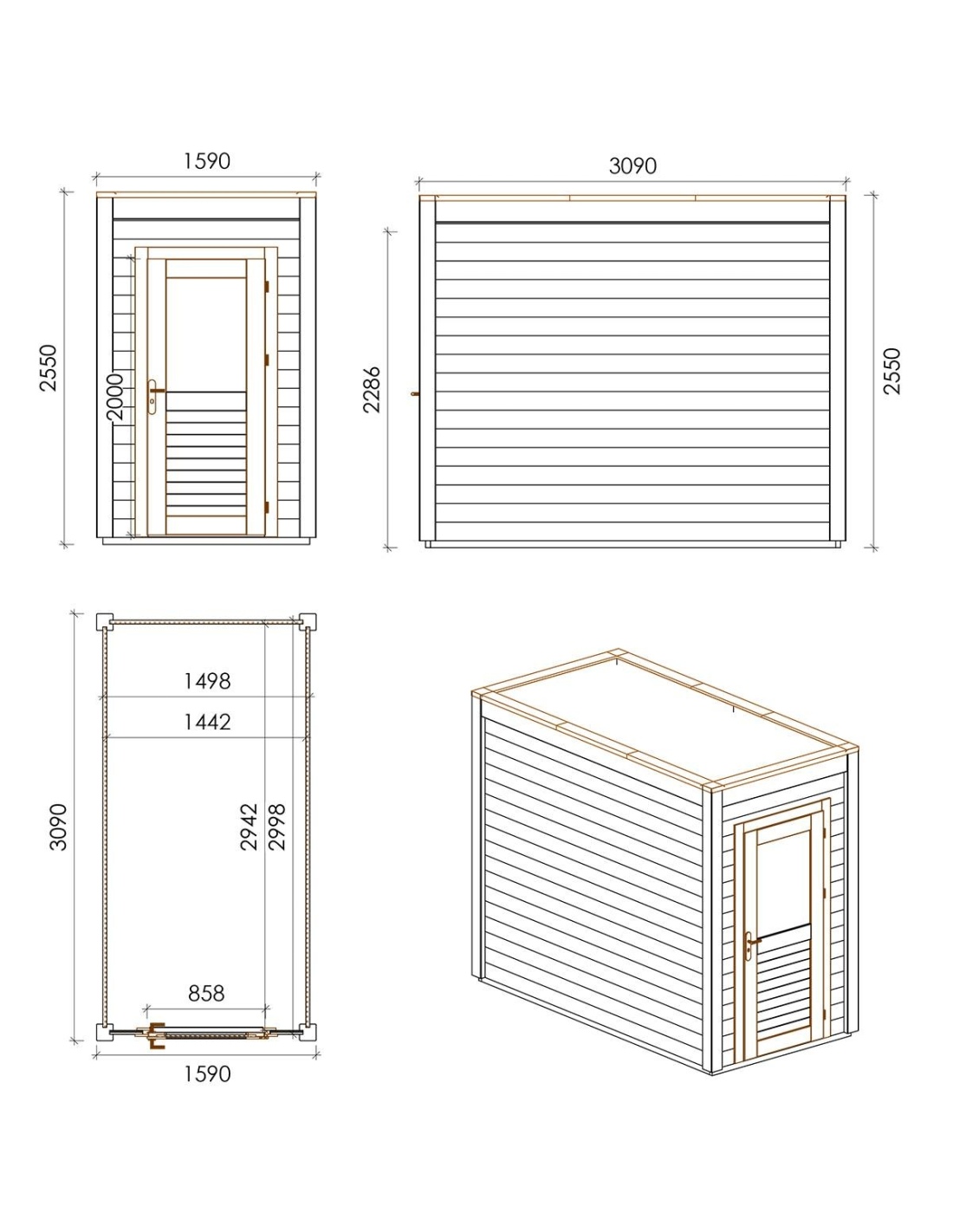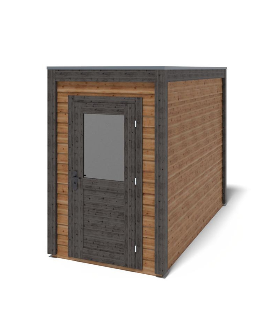 Die Fotos zeigen das Holzhaus 000160 mit der Fläche von 4.91 m2, Frontbreite von 1.59M und Tiefe von 3.09M.