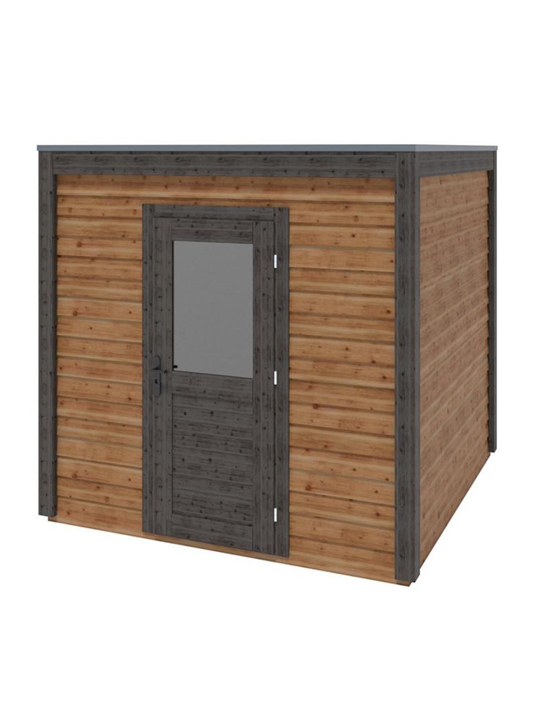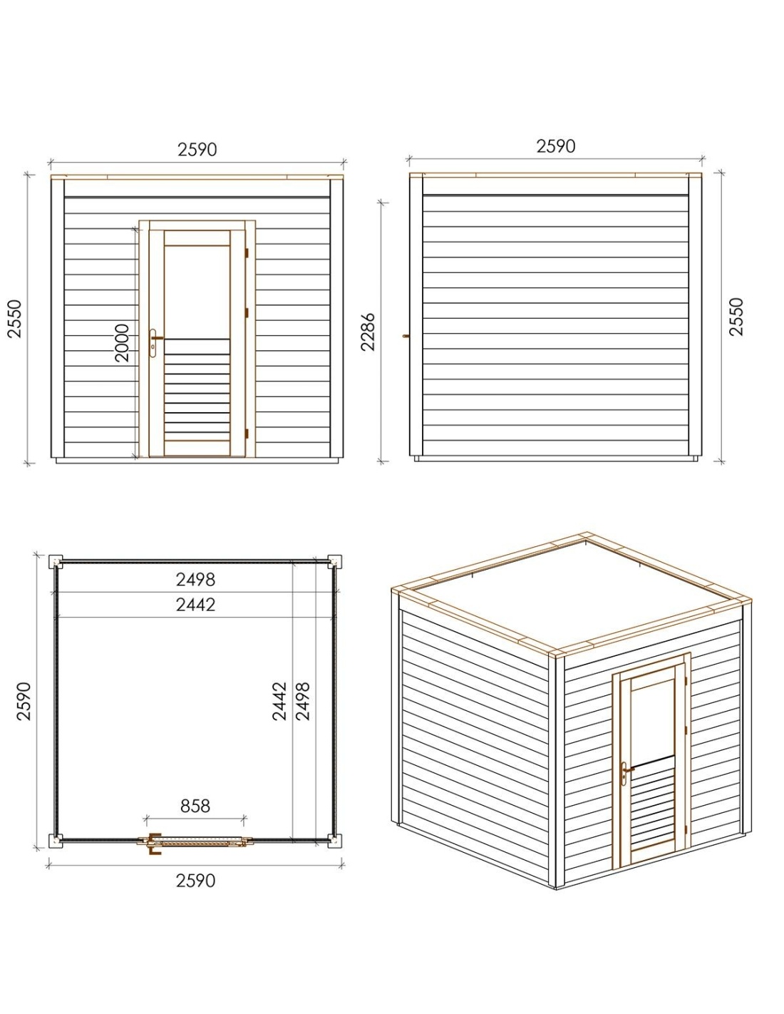 Die Fotos zeigen das Holzhaus 000167 mit der Fläche von 6.71 m2, Frontbreite von 2.59M und Tiefe von 2.59M.