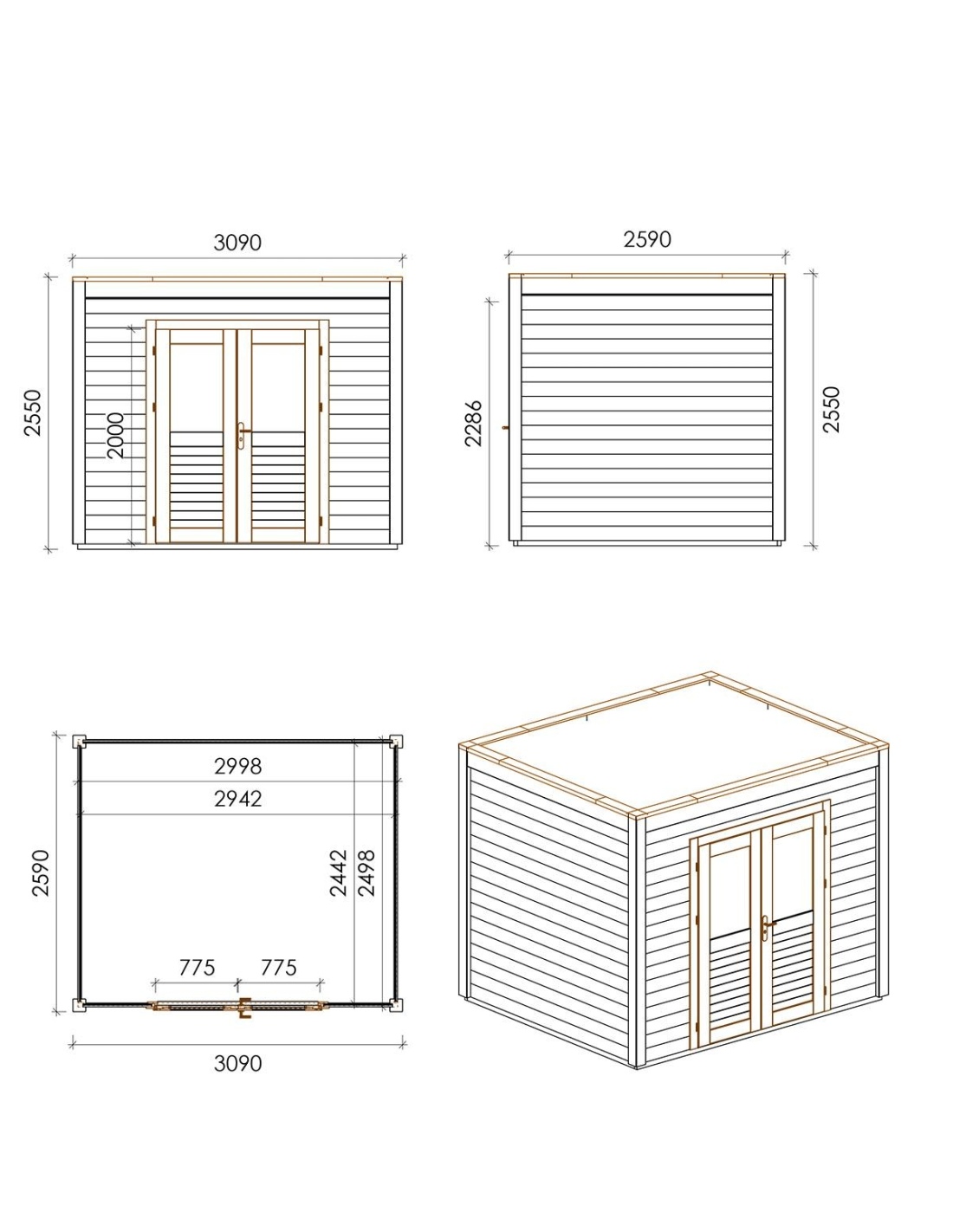 Die Fotos zeigen das Holzhaus 000169 mit der Fläche von 8 m2, Frontbreite von 3.09M und Tiefe von 2.59M.
