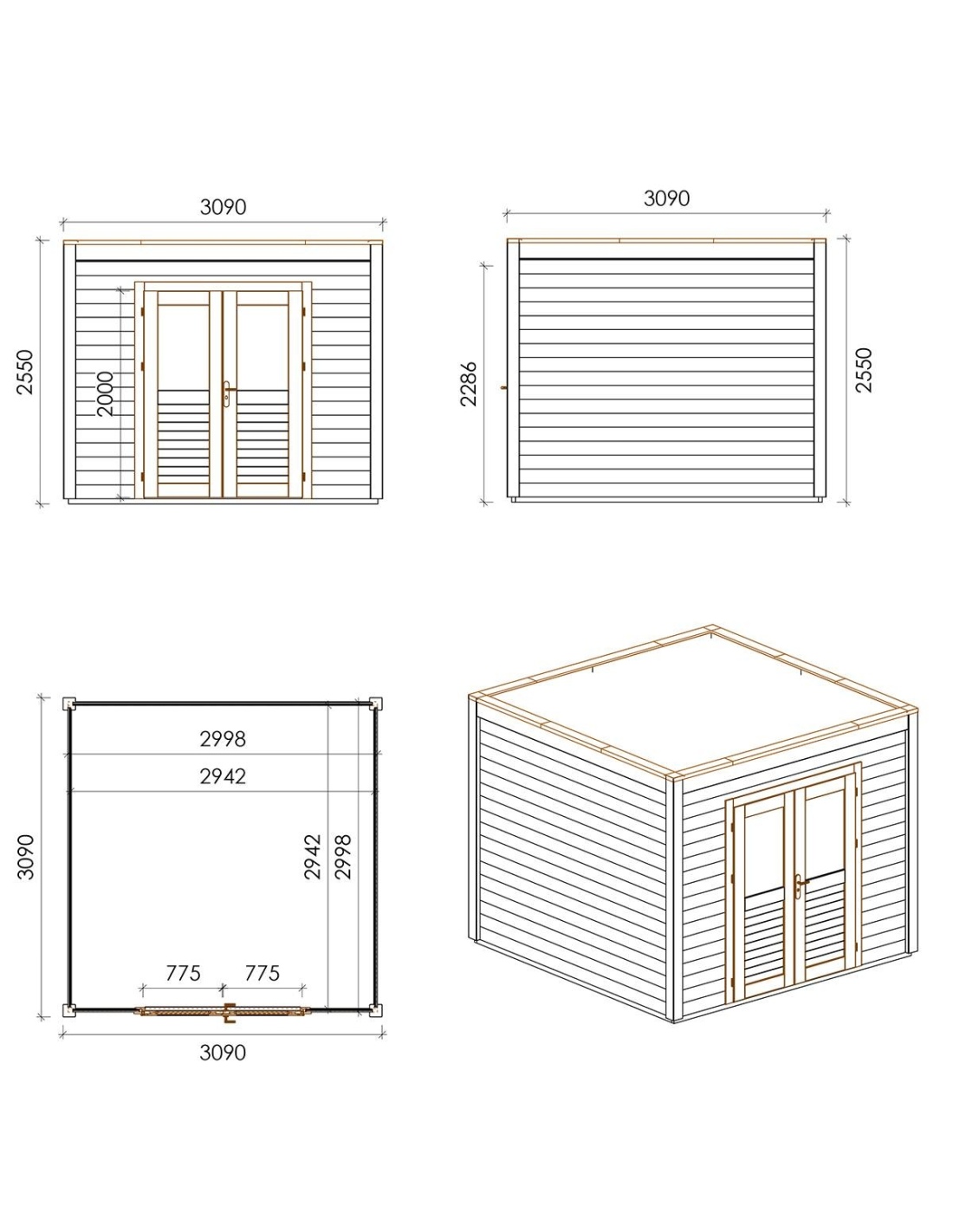 Die Fotos zeigen das Holzhaus 000170 mit der Fläche von 9.55 m2, Frontbreite von 3.09M und Tiefe von 3.09M.