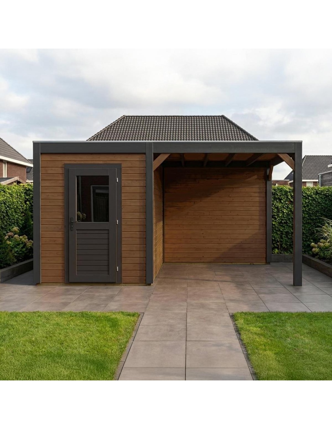 (!) Das Produkt enthält keine Dacheindeckung und kein Wasserableitungssystem – es ist notwendig, eine EPDM-Folie mit Montageprofilen sowie ein Fallrohr zur Dachentwässerung zu erwerben, um Schutz vor Witterungseinflüssen zu gewährleisten.