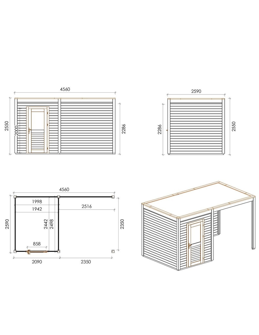 Die Fotos zeigen das Holzhaus 000088 mit der Fläche von 11.81 m2, Frontbreite von 4.56M und Tiefe von 2.59M.