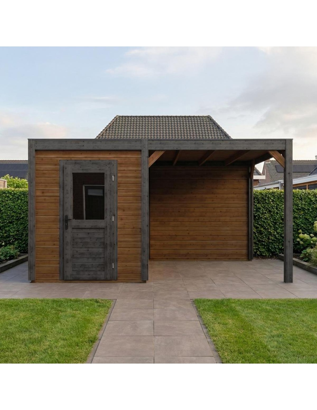 (!) Das Produkt enthält keine Dacheindeckung und kein Wasserableitungssystem – es ist notwendig, eine EPDM-Folie mit Montageprofilen sowie ein Fallrohr zur Dachentwässerung zu erwerben, um Schutz vor Witterungseinflüssen zu gewährleisten.