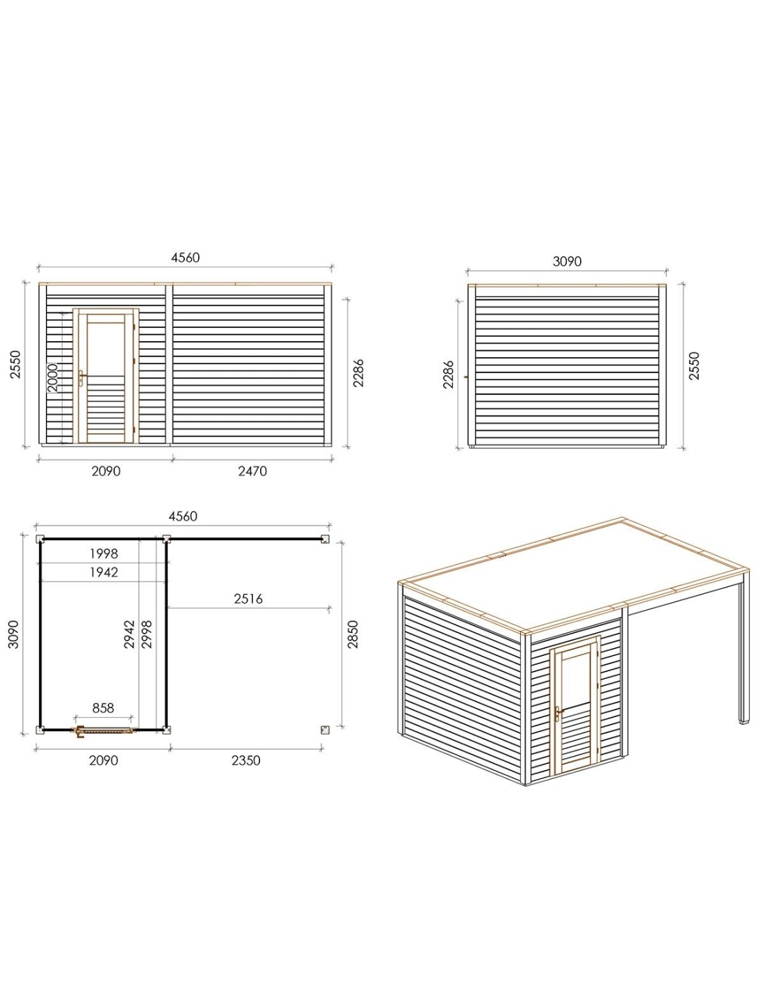 Die Fotos zeigen das Holzhaus 000090 mit der Fläche von 14.09 m2, Frontbreite von 4.56M und Tiefe von 3.09M.