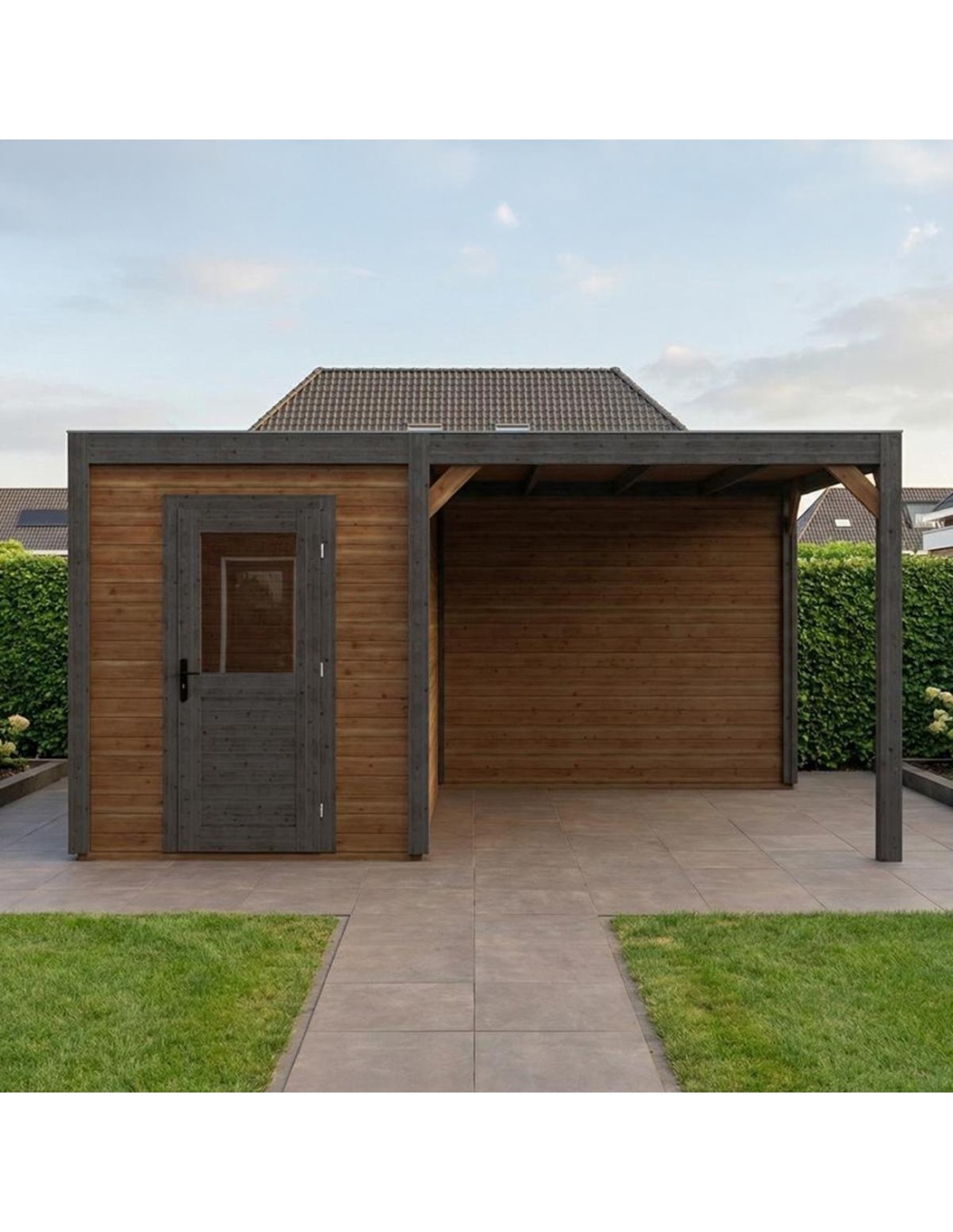 (!) Das Produkt enthält keine Dacheindeckung und kein Wasserableitungssystem – es ist notwendig, eine EPDM-Folie mit Montageprofilen sowie ein Fallrohr zur Dachentwässerung zu erwerben, um Schutz vor Witterungseinflüssen zu gewährleisten.