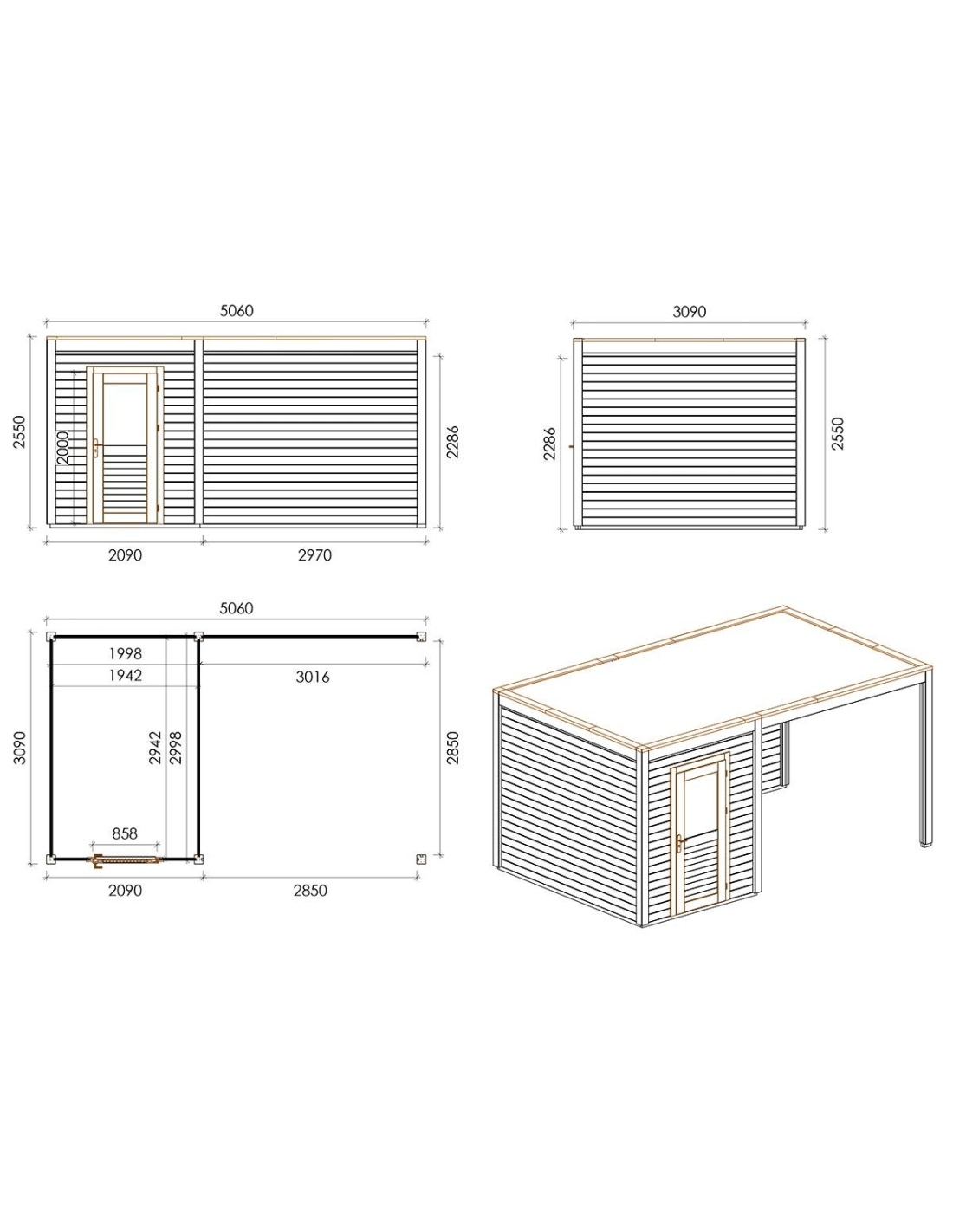 Die Fotos zeigen das Holzhaus 000091 mit der Fläche von 15.64 m2, Frontbreite von 5.06M und Tiefe von 3.09M.