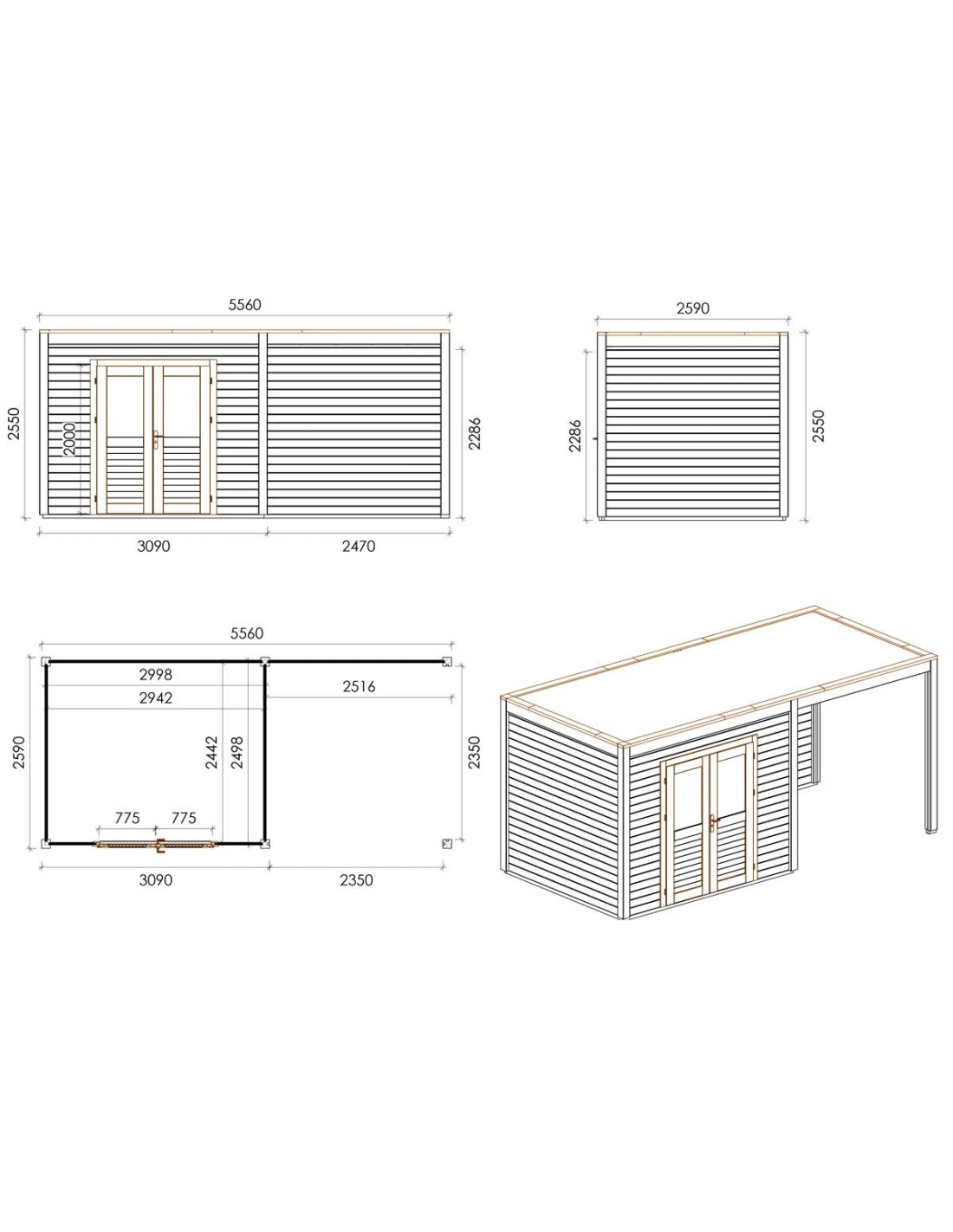 Die Fotos zeigen das Holzhaus 000098 mit der Fläche von 14.4 m2, Frontbreite von 5.56M und Tiefe von 2.59M.
