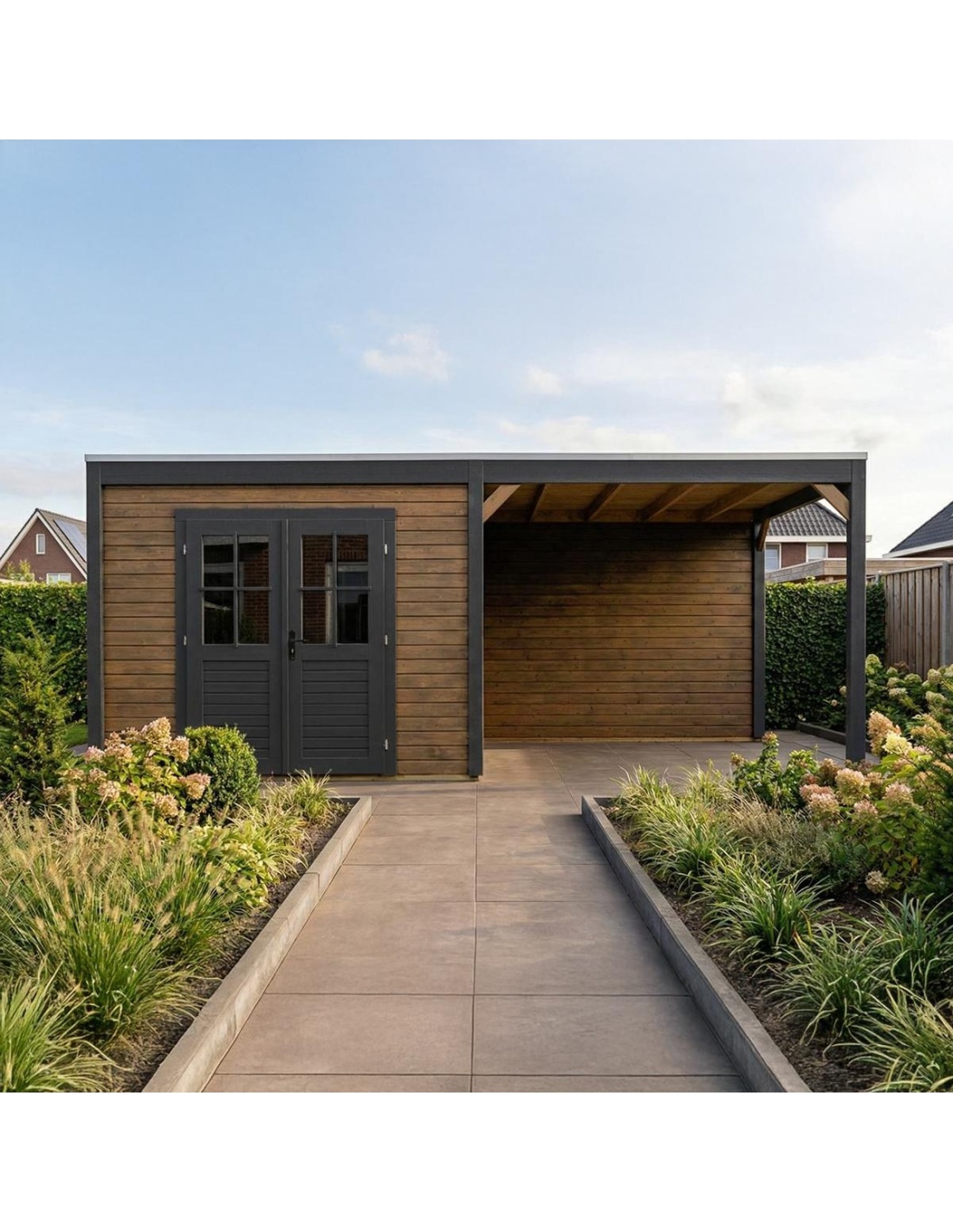 (!) Das Produkt enthält keine Dacheindeckung und kein Wasserableitungssystem – es ist notwendig, eine EPDM-Folie mit Montageprofilen sowie ein Fallrohr zur Dachentwässerung zu erwerben, um Schutz vor Witterungseinflüssen zu gewährleisten.