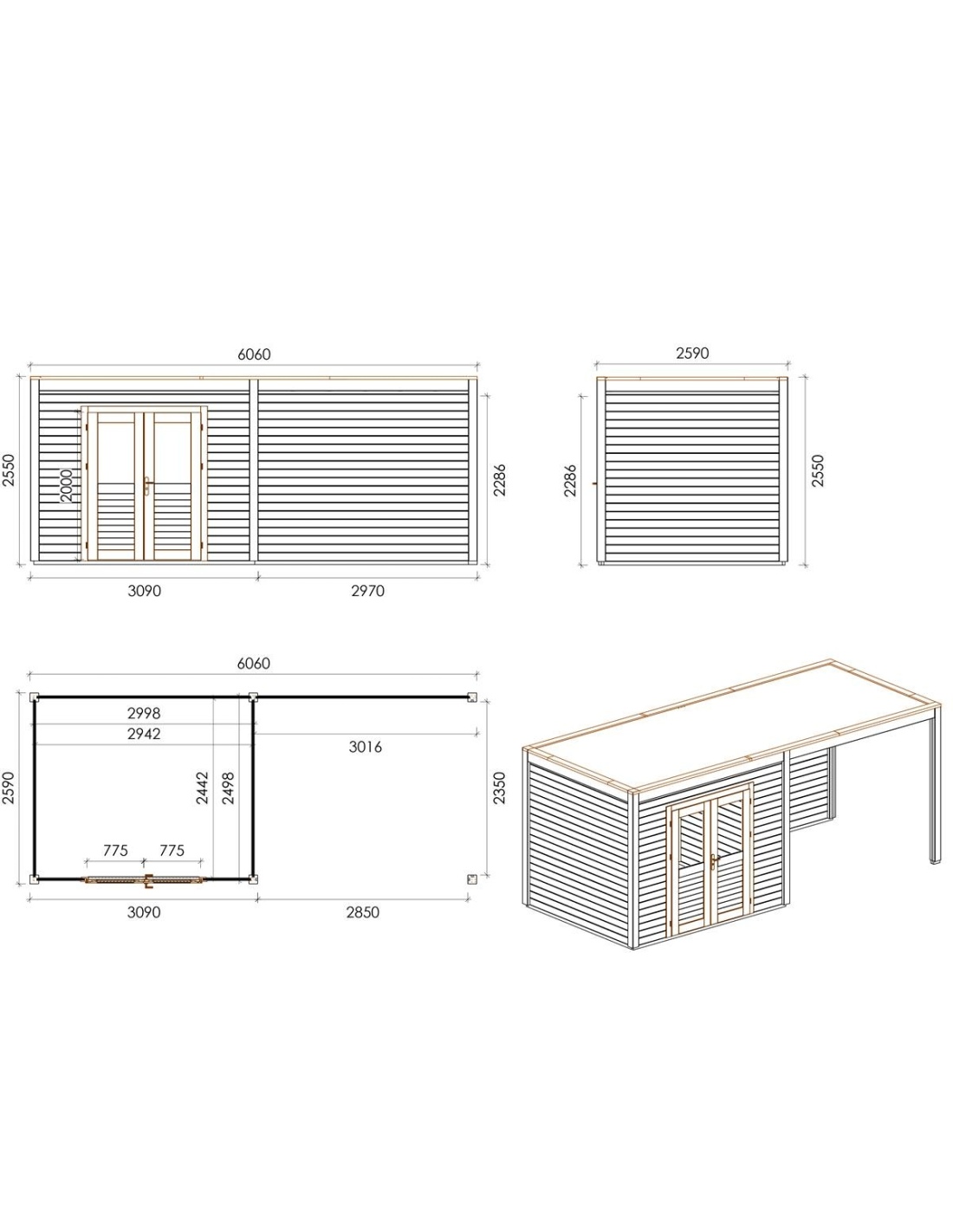 Die Fotos zeigen das Holzhaus 000099 mit der Fläche von 15.7 m2, Frontbreite von 6.06M und Tiefe von 2.59M.