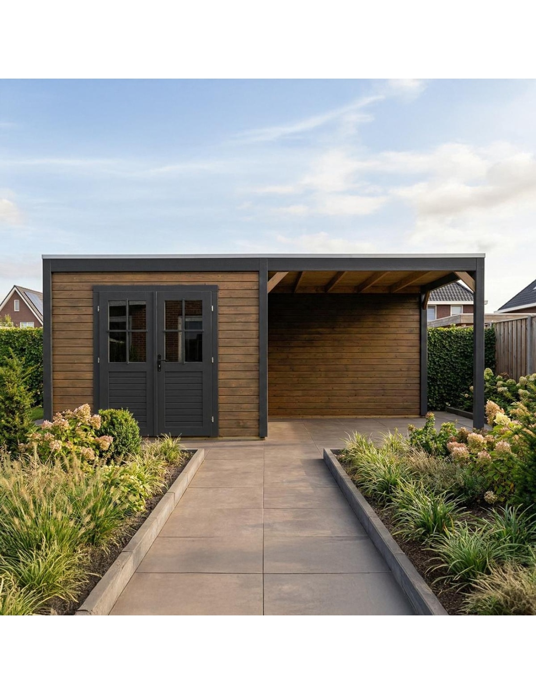 (!) Das Produkt enthält keine Dacheindeckung und kein Wasserableitungssystem – es ist notwendig, eine EPDM-Folie mit Montageprofilen sowie ein Fallrohr zur Dachentwässerung zu erwerben, um Schutz vor Witterungseinflüssen zu gewährleisten.