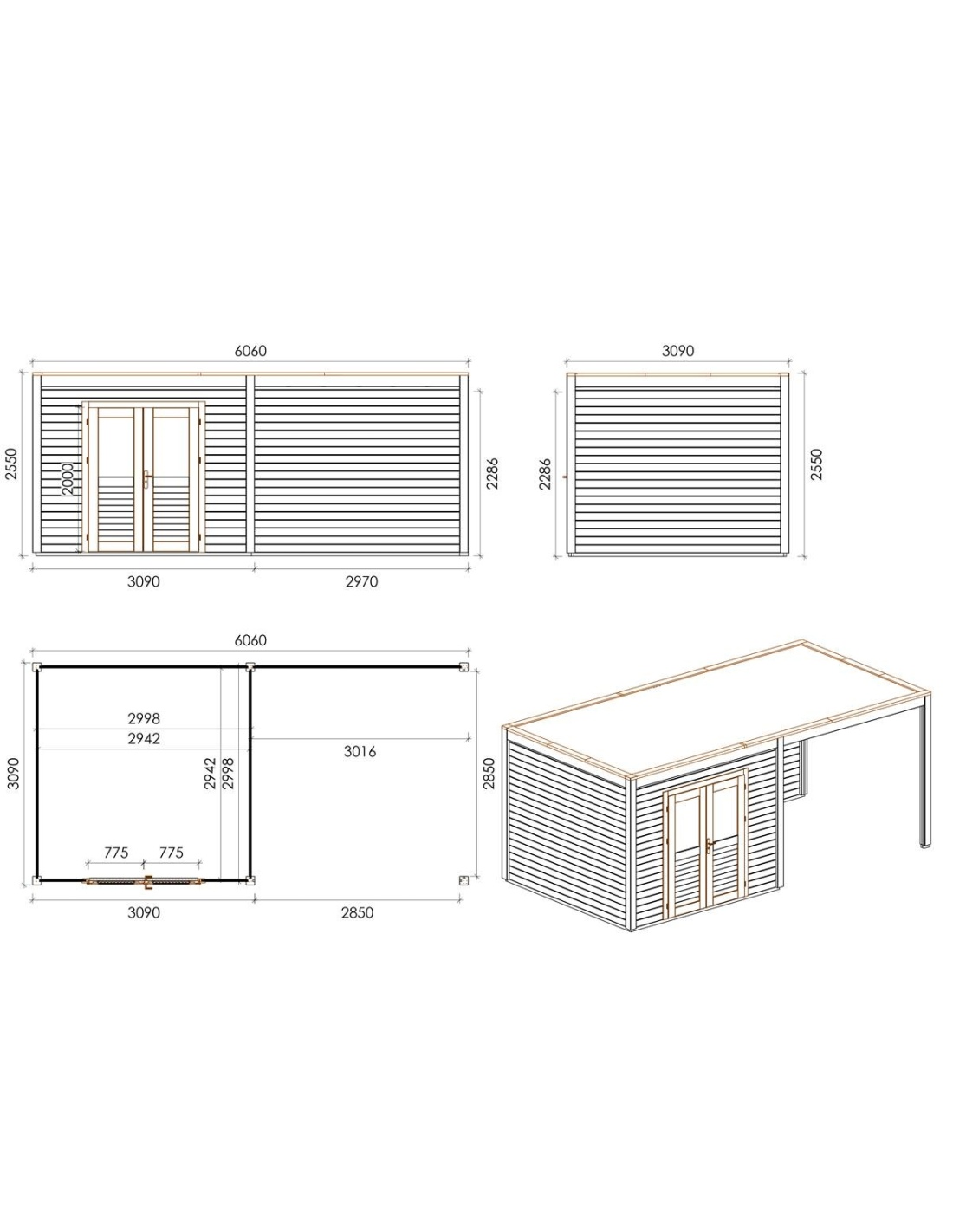 Die Fotos zeigen das Holzhaus 000101 mit der Fläche von 18.73 m2, Frontbreite von 6.06M und Tiefe von 3.09M.