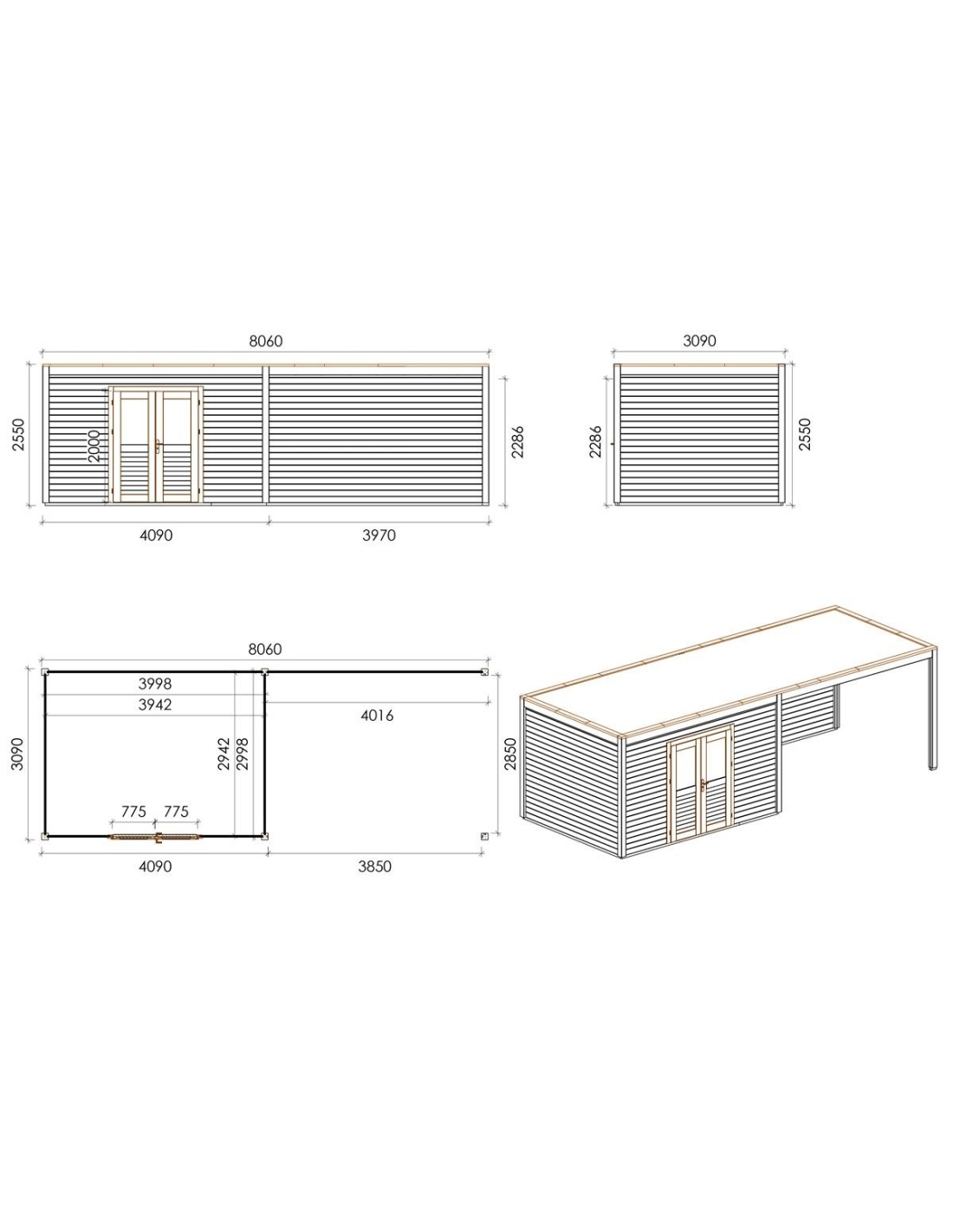 Die Fotos zeigen das Holzhaus 000107 mit der Fläche von 24.91 m2, Frontbreite von 8.06M und Tiefe von 3.09M.