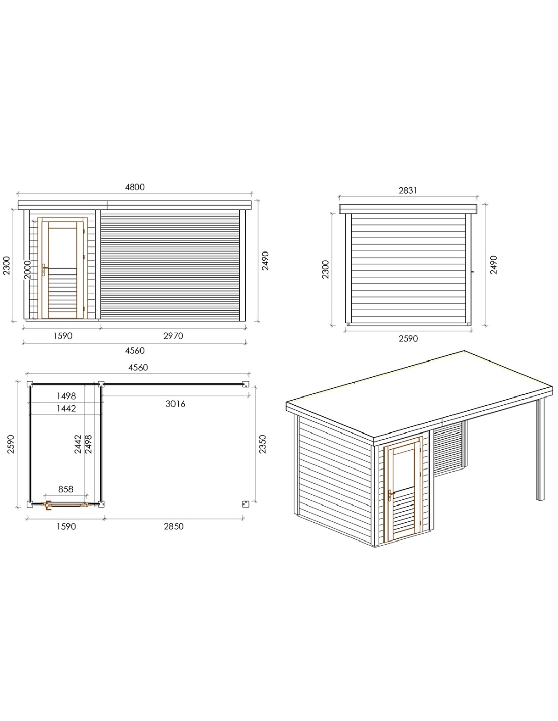 Die Fotos zeigen das Holzhaus 000133 mit der Fläche von 11.81 m2, Frontbreite von 4.56M und Tiefe von 2.59M.