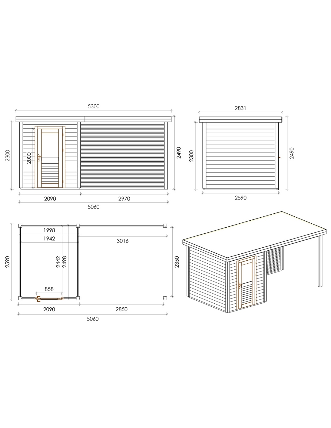 (!) Das Produkt enthält keine Dacheindeckung und kein Wasserableitungssystem – es ist notwendig, eine EPDM-Folie mit Montageprofilen sowie ein Fallrohr zur Dachentwässerung zu erwerben, um Schutz vor Witterungseinflüssen zu gewährleisten.