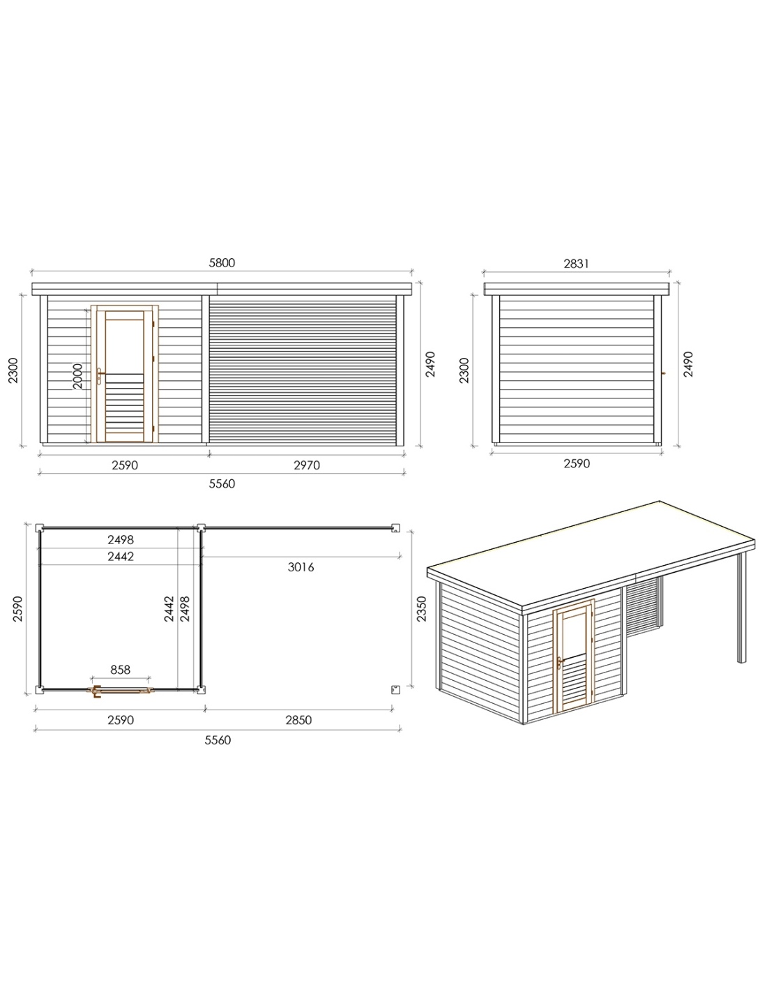 Die Fotos zeigen das Holzhaus 000143 mit der Fläche von 14.4 m2, Frontbreite von 5.56M und Tiefe von 2.59M.