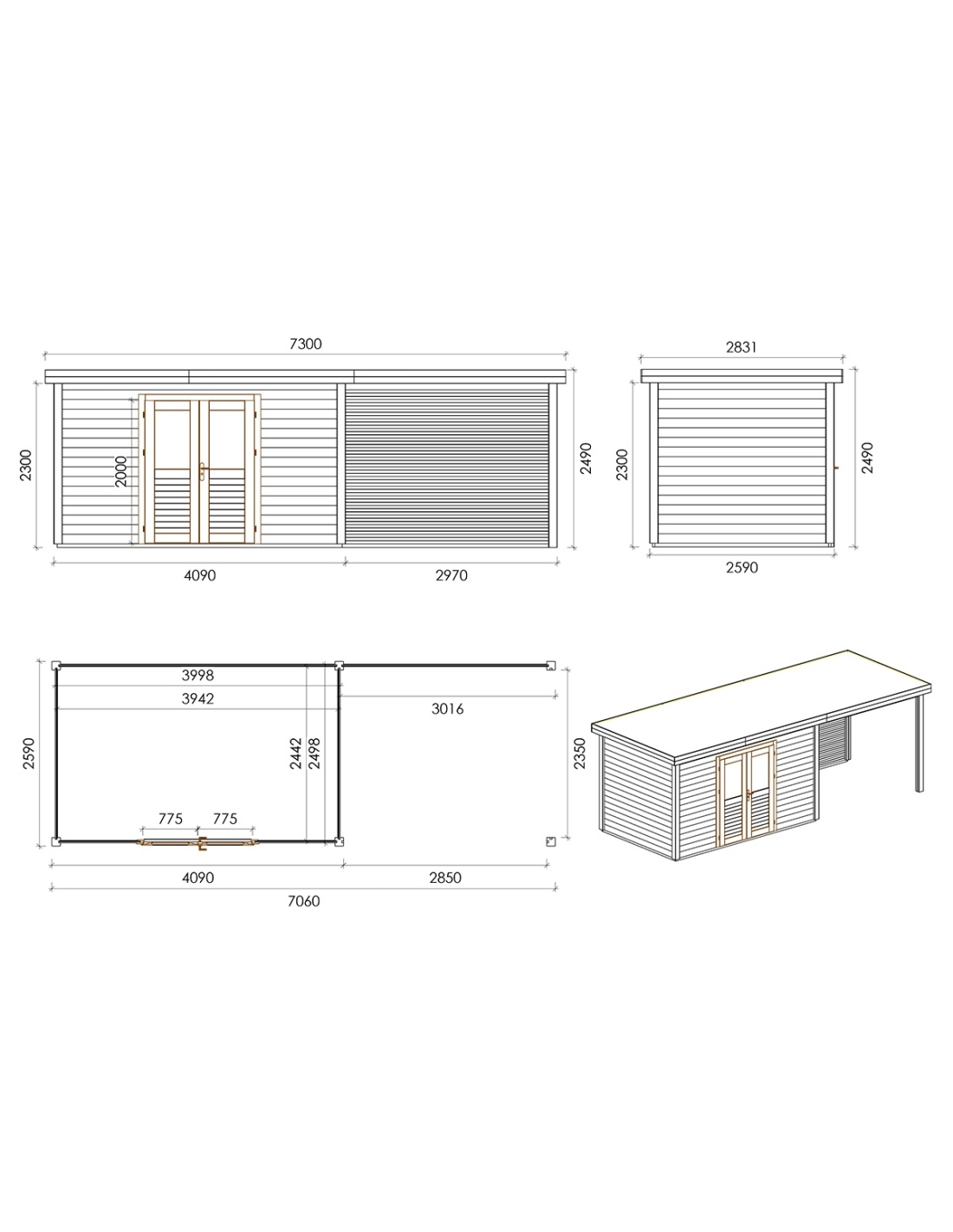 Die Fotos zeigen das Holzhaus 000153 mit der Fläche von 16.99 m2, Frontbreite von 6.56M und Tiefe von 2.59M.