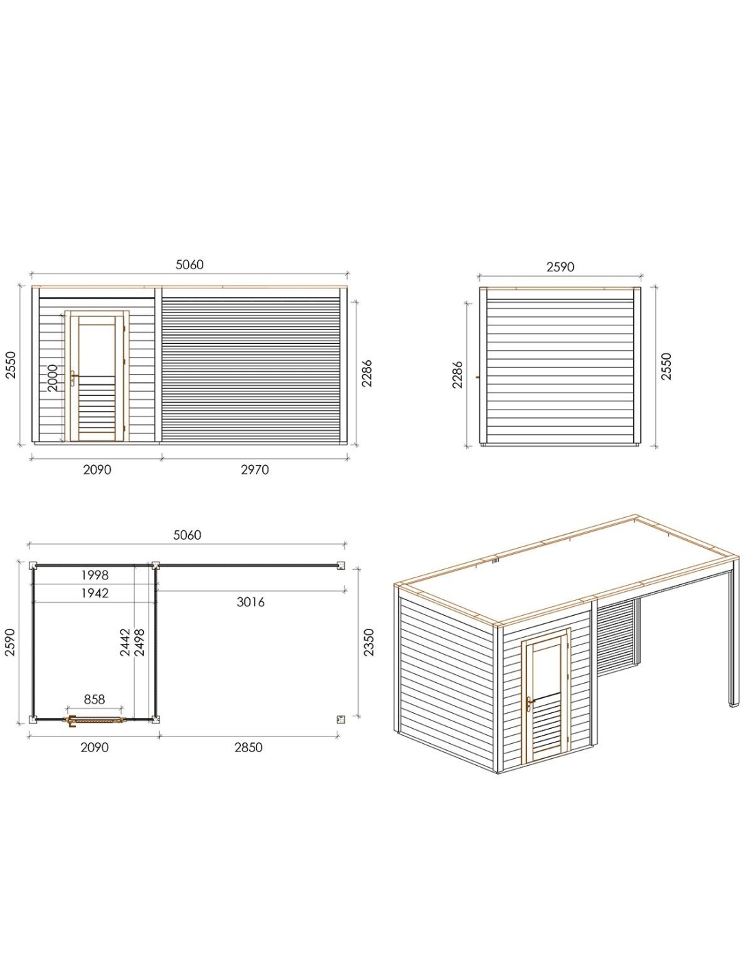 Die Fotos zeigen das Holzhaus 000187 mit der Fläche von 13.11 m2, Frontbreite von 5.06M und Tiefe von 2.59M.