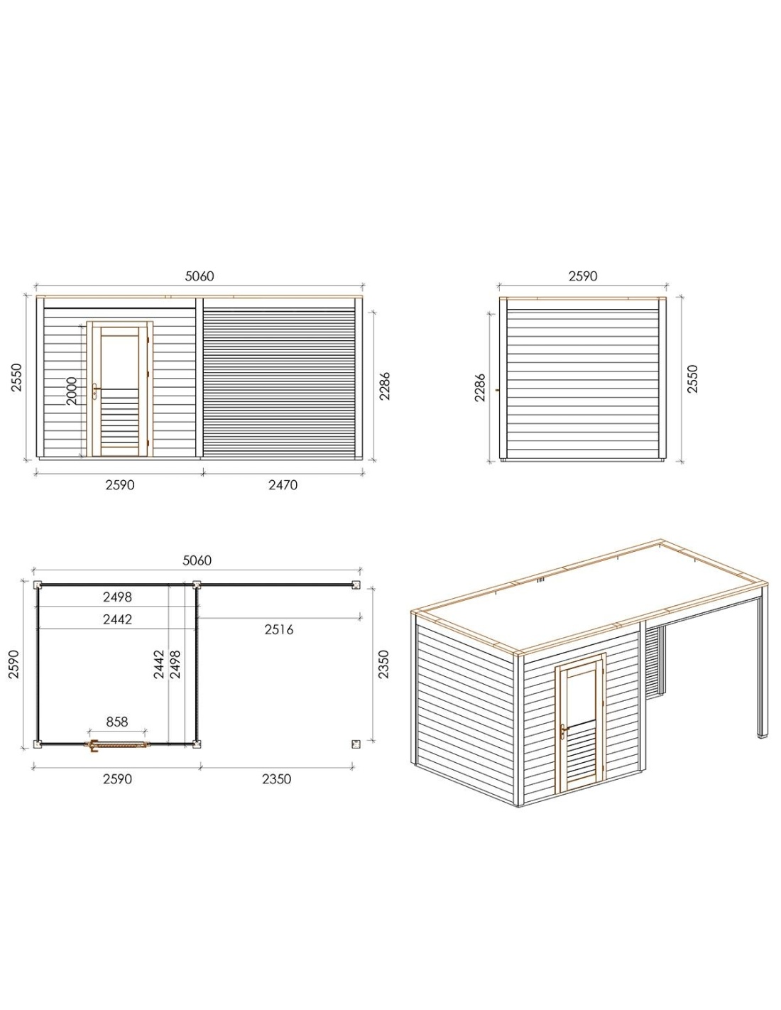 Die Fotos zeigen das Holzhaus 000191 mit der Fläche von 13.11 m2, Frontbreite von 5.06M und Tiefe von 2.59M.