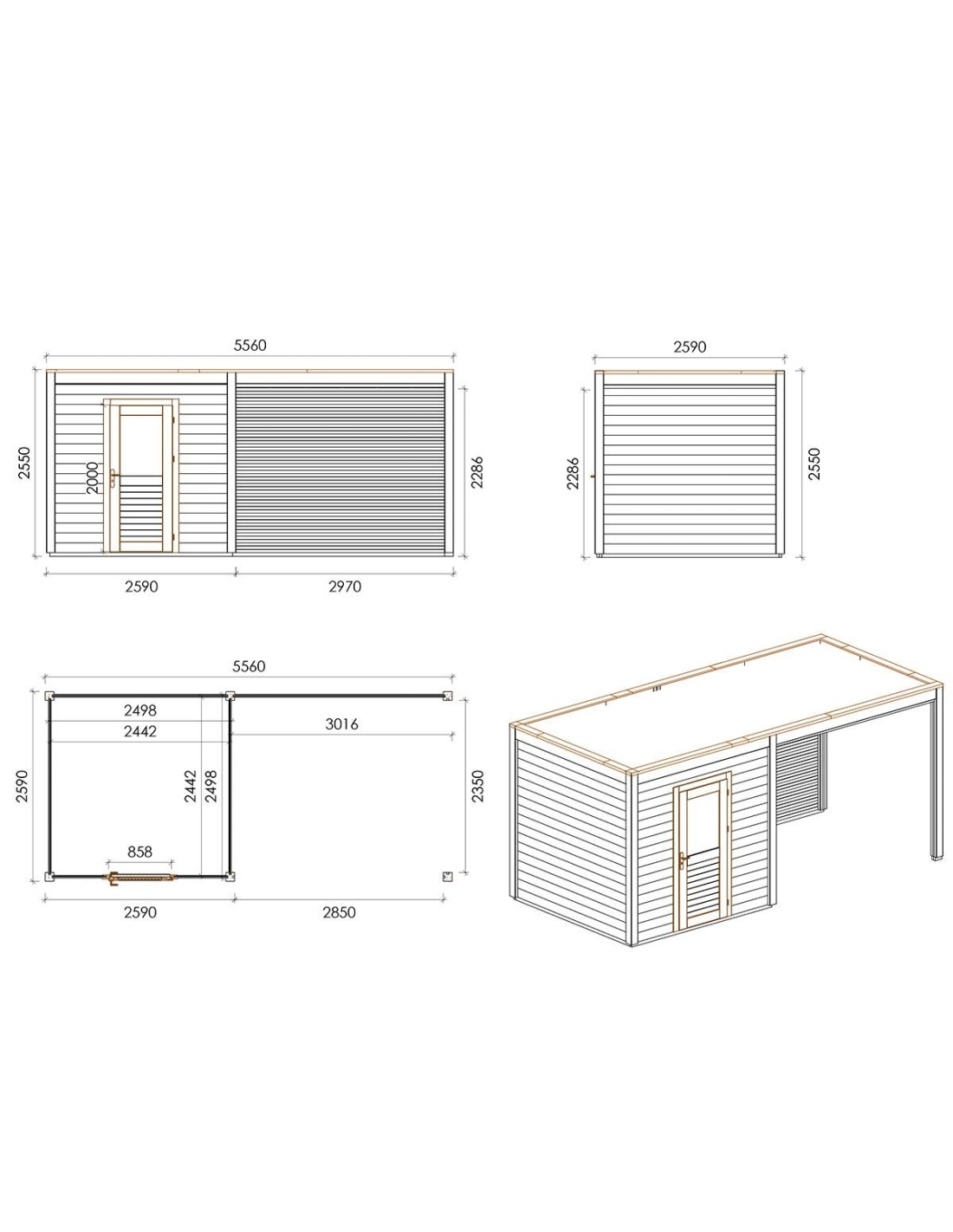 Die Fotos zeigen das Holzhaus 000192 mit der Fläche von 14.4 m2, Frontbreite von 5.56M und Tiefe von 2.59M.
