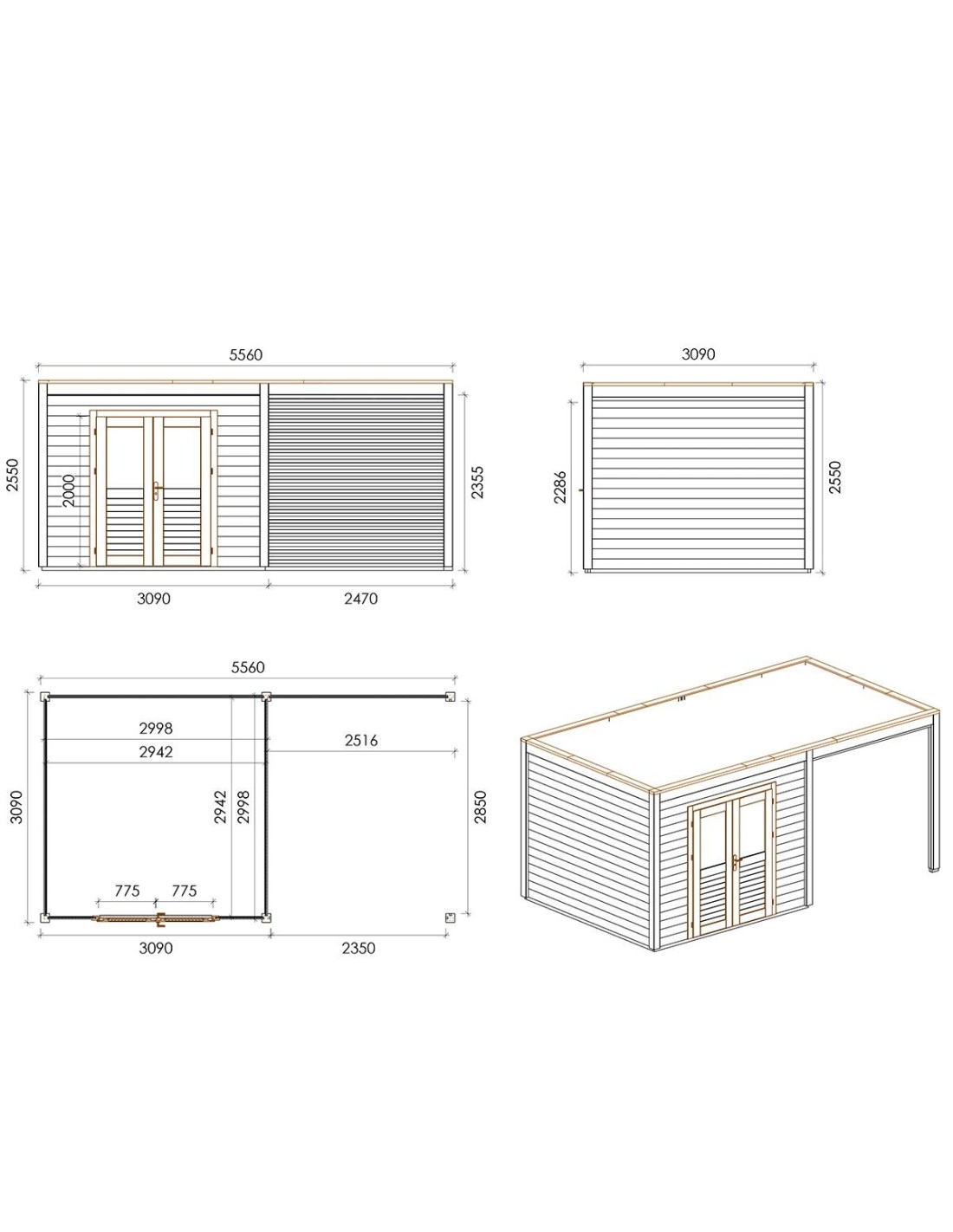 Die Fotos zeigen das Holzhaus 000198 mit der Fläche von 17.18 m2, Frontbreite von 5.56M und Tiefe von 3.09M.
