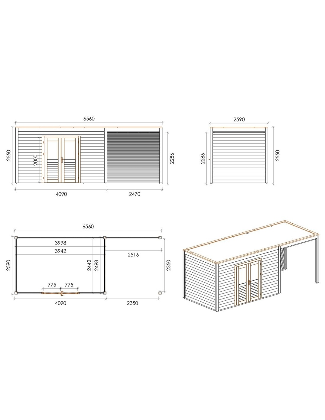 Die Fotos zeigen das Holzhaus 000201 mit der Fläche von 16.99 m2, Frontbreite von 6.56M und Tiefe von 2.59M.